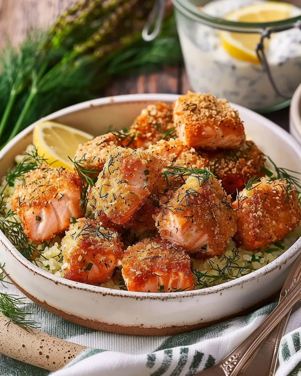 - Serve the crispy salmon bites with lemon dill sauce.