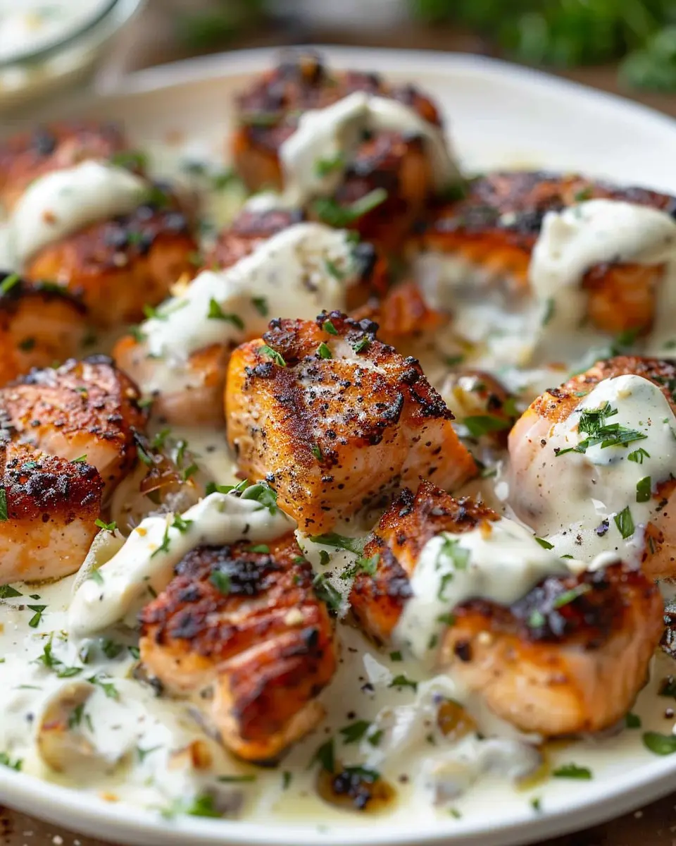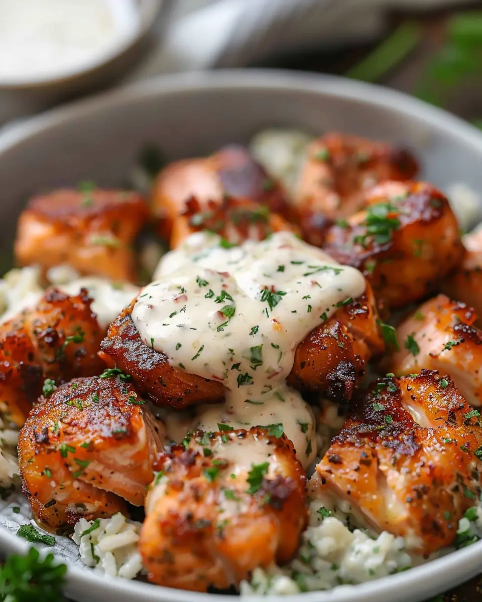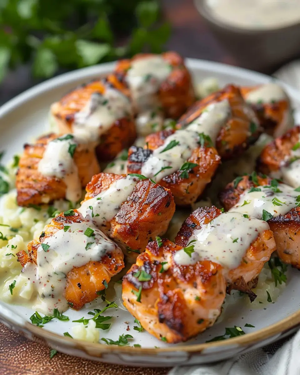 - Once the salmon bites are done, serve them drizzled with the garlic cream sauce.