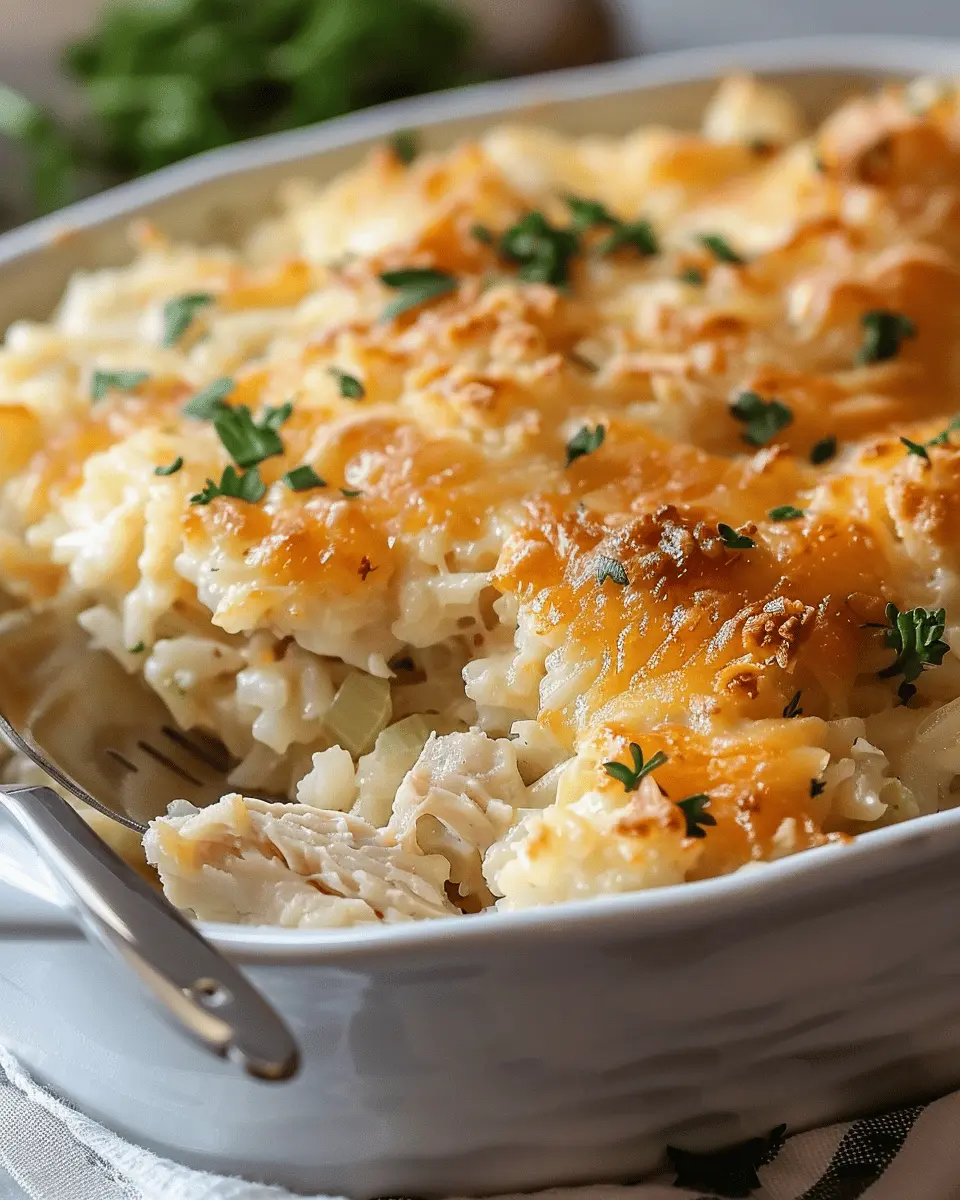 A delicious and comforting casserole featuring tender chicken and flavorful turkey bacon, perfect for a family meal.