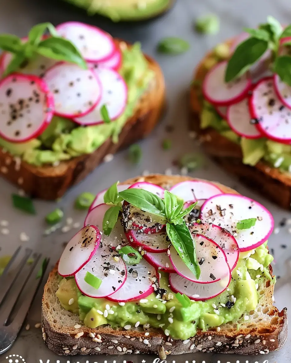 • Radishes on Top: Place your thinly sliced radishes on top of the avocado. Their crunch and slight spiciness will contrast beautifully with the creamy texture below.