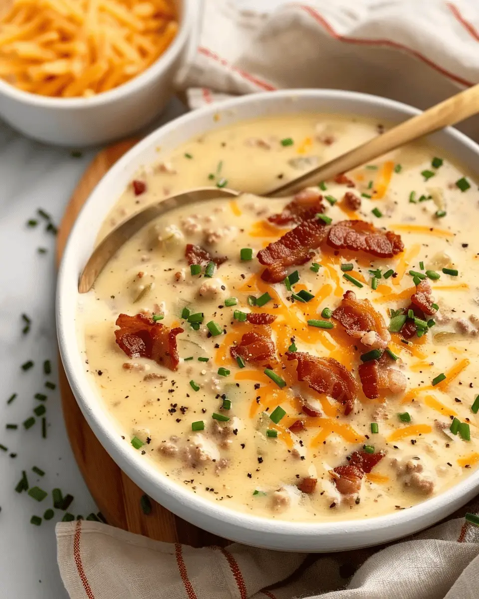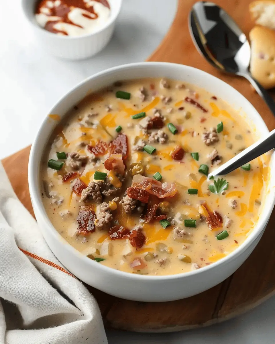 A rich and creamy soup that combines the flavors of a classic bacon cheeseburger, perfect for cozy evenings.