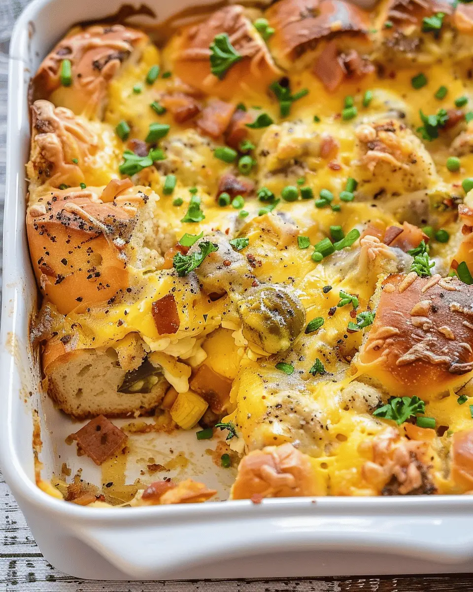 A delicious and easy-to-make breakfast casserole featuring bagels, turkey bacon, and chicken ham.