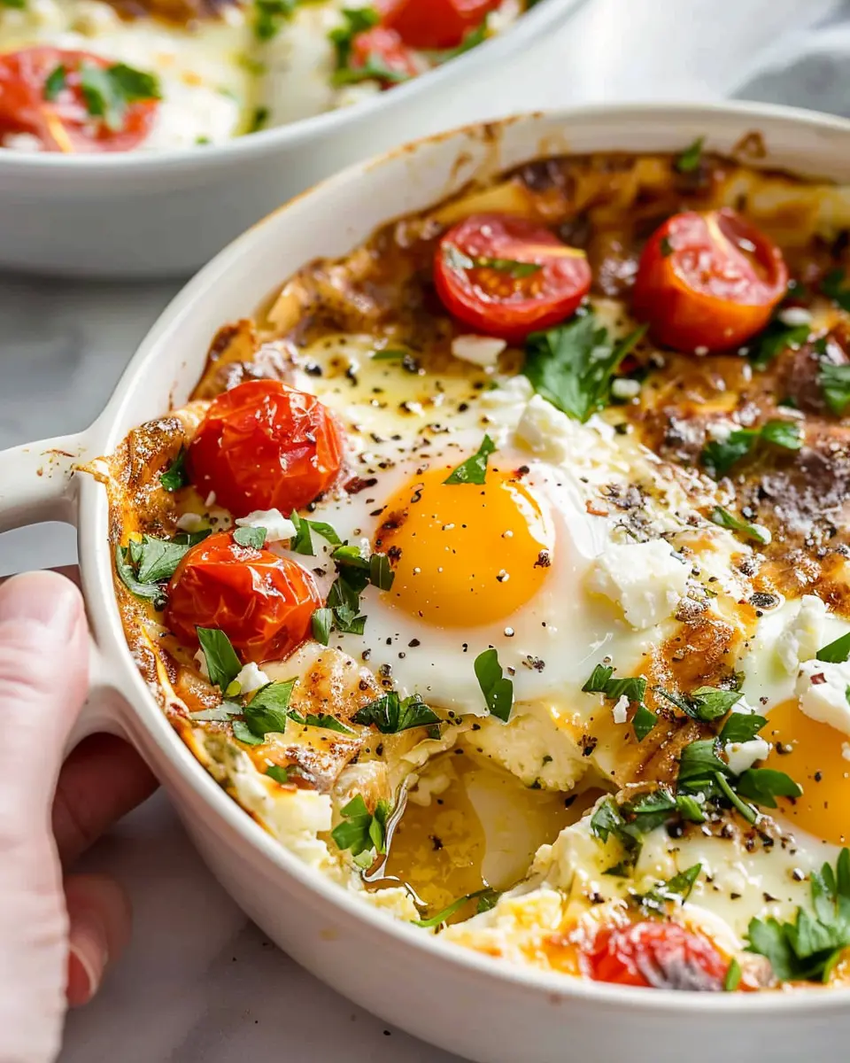 Return your dish to the oven and bake for an additional 8-10 minutes, or until the eggs are set to your liking. For a firmer yolk, give it a little extra time. When it’s ready, pull it out and let it cool for a minute or two. Serve hot and savor this beautiful dish with a side of crusty bread or a fresh salad. Trust me, you’ll be the star of the evening!