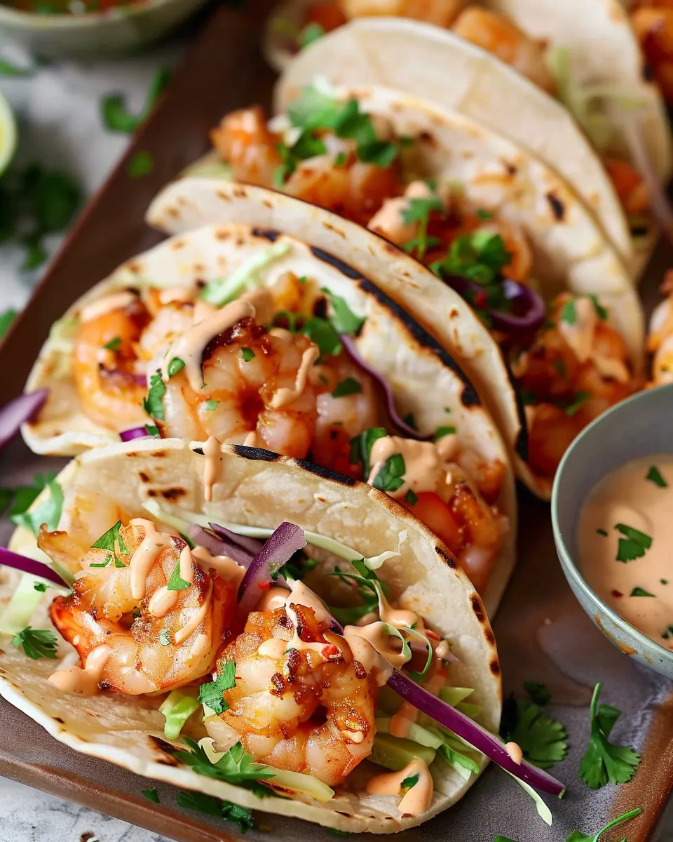 - Assemble the tacos by placing shrimp on tortillas, topping with cabbage, cilantro, and drizzling with sauce.