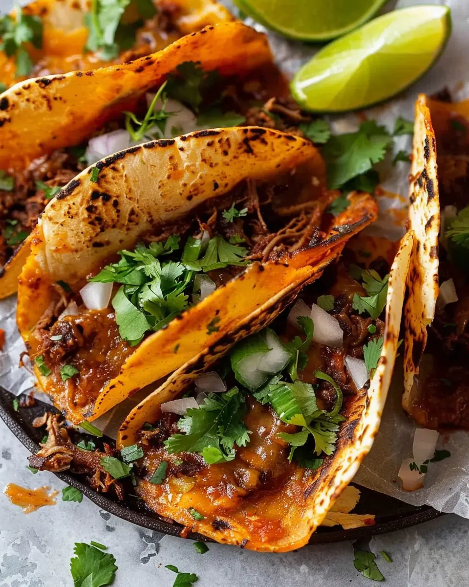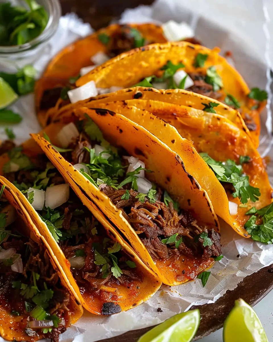 Crispy tacos are a game changer. For that perfect crunch, use corn tortillas, but don’t just toss them in the pan. Lightly fry them in a bit of oil until golden brown before filling them with your juicy birria. If you’re up for a little extra work, dip the tortillas briefly in the braising liquid before frying for added flavor.