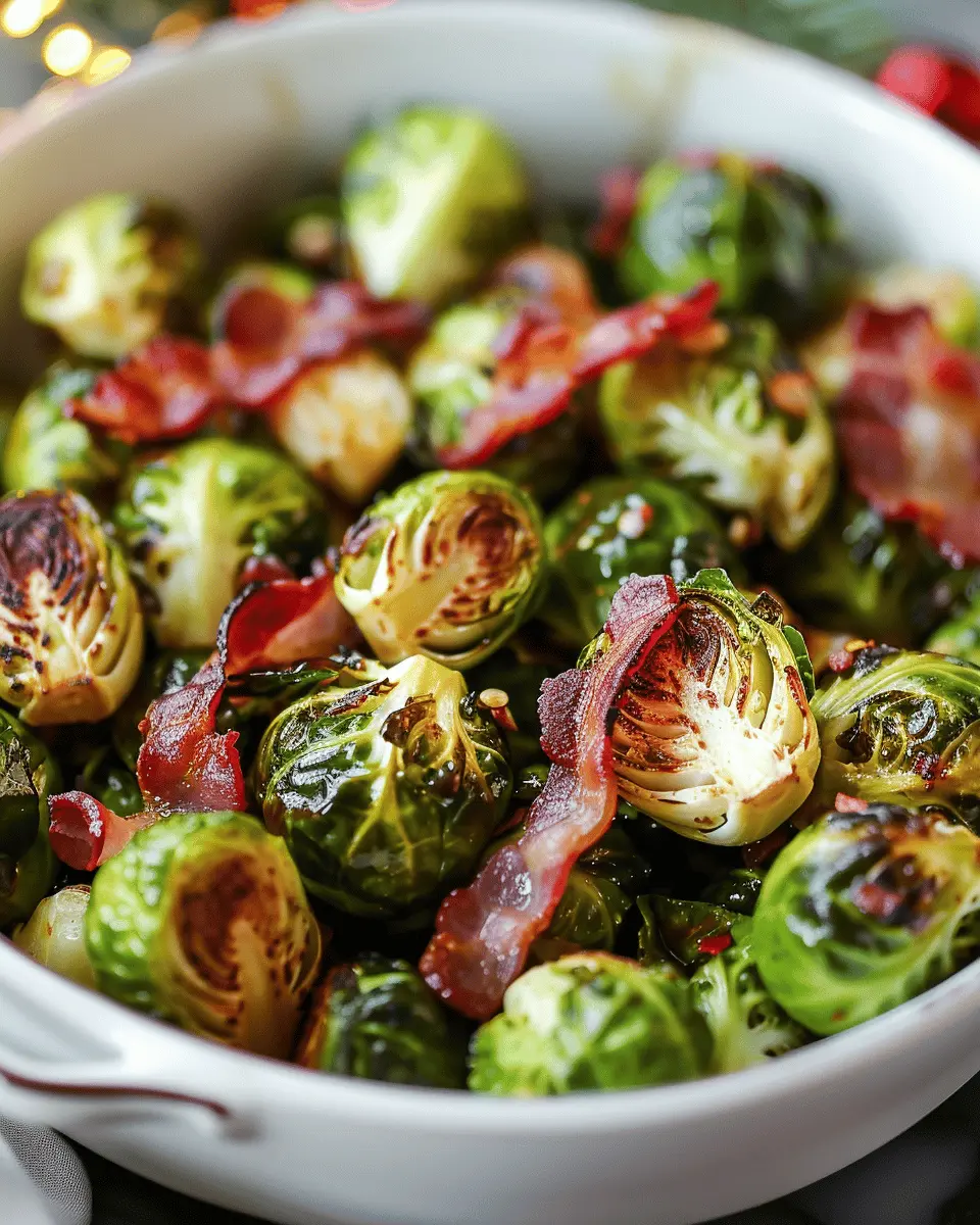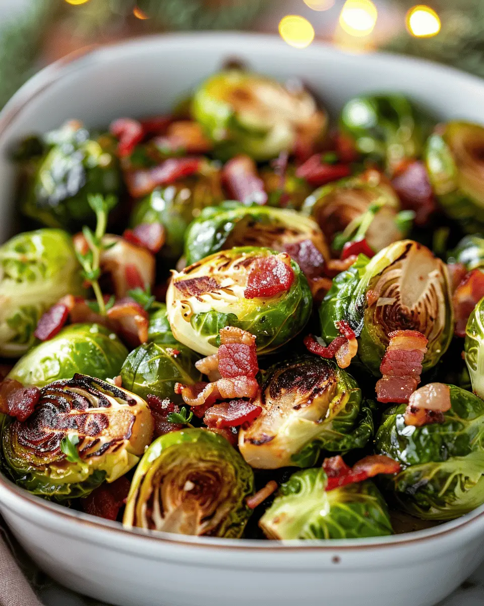 Pair with Protein: Serve these Brussels sprouts alongside roasted chicken, grilled salmon, or a tender beef steak. The smoky flavor of the turkey bacon adds a savory depth that enhances the richness of the meat.