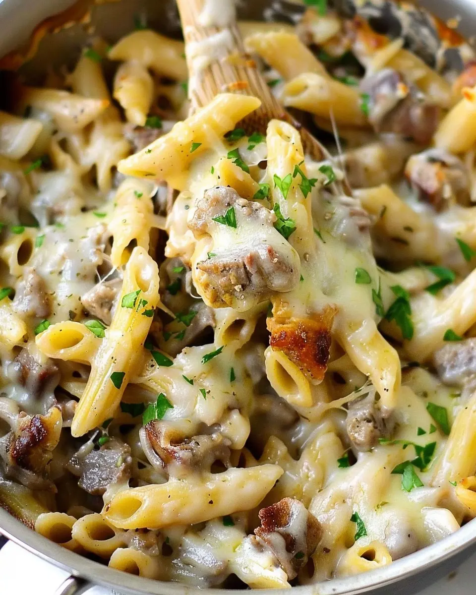 A delicious and hearty dish that combines the flavors of a classic cheesesteak with pasta for an indulgent meal.