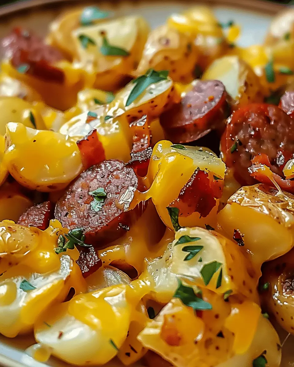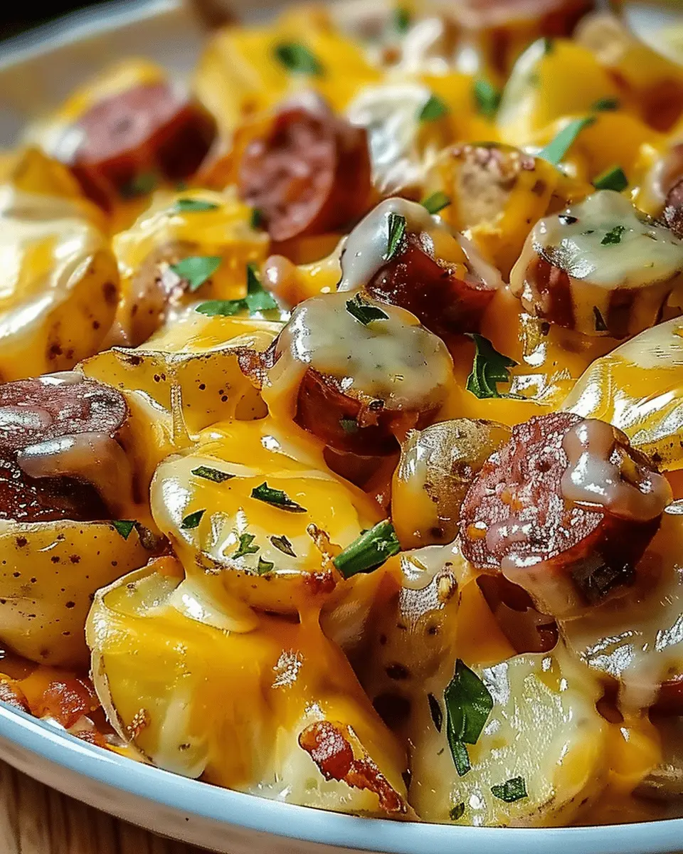 Enjoy a warm and cheesy dish perfect for cozy nights, combining tender potatoes, smoky sausage, and ranch flavor.