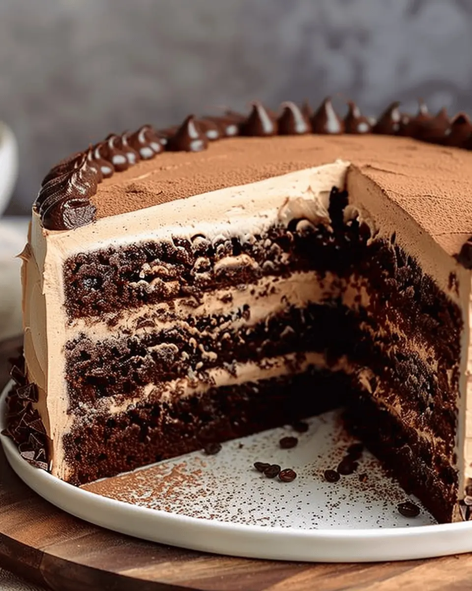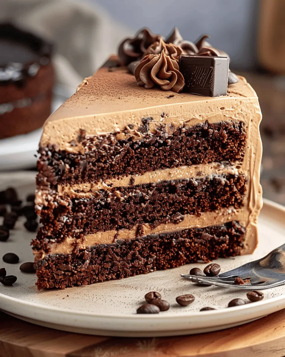 A rich and decadent chocolate cake infused with coffee flavor, perfect for dessert lovers.