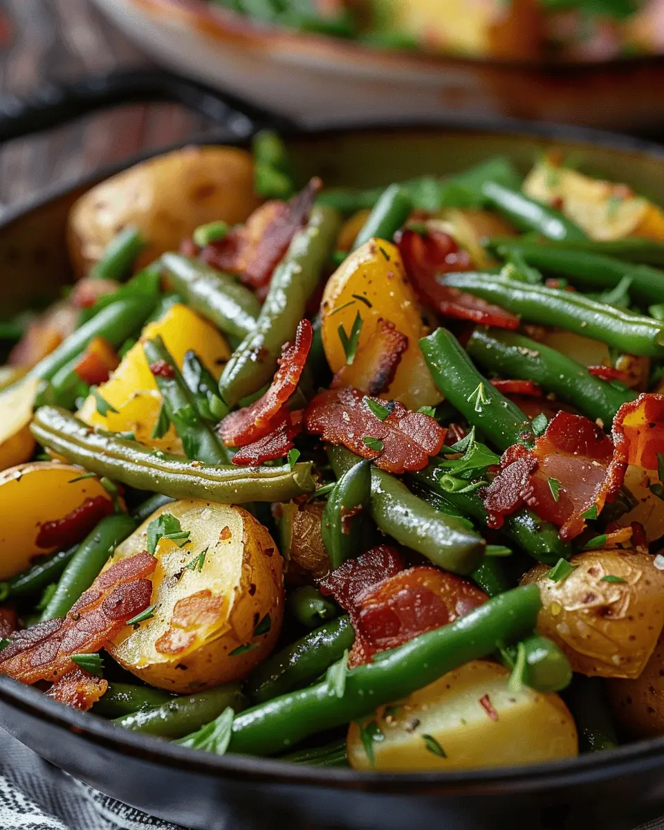 A delicious and healthy recipe combining green beans, potatoes, and turkey bacon.