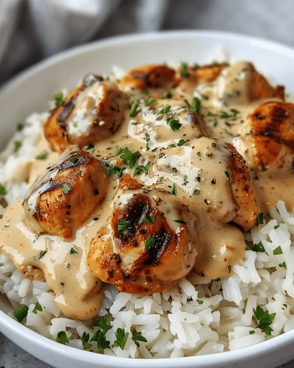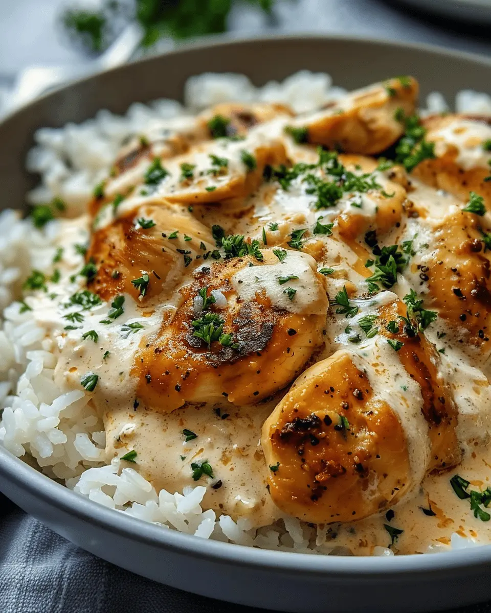 Indulge in this creamy and flavorful smothered chicken served over rice, perfect for any dinner table.