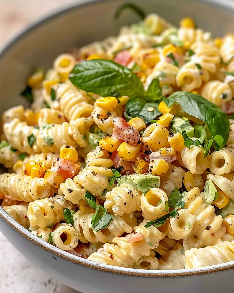 A delicious and easy recipe for Creamy Street Corn Pasta Salad featuring turkey bacon, perfect for summer gatherings.