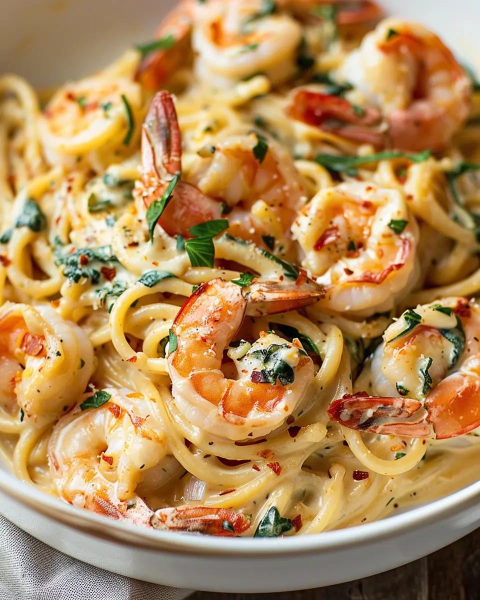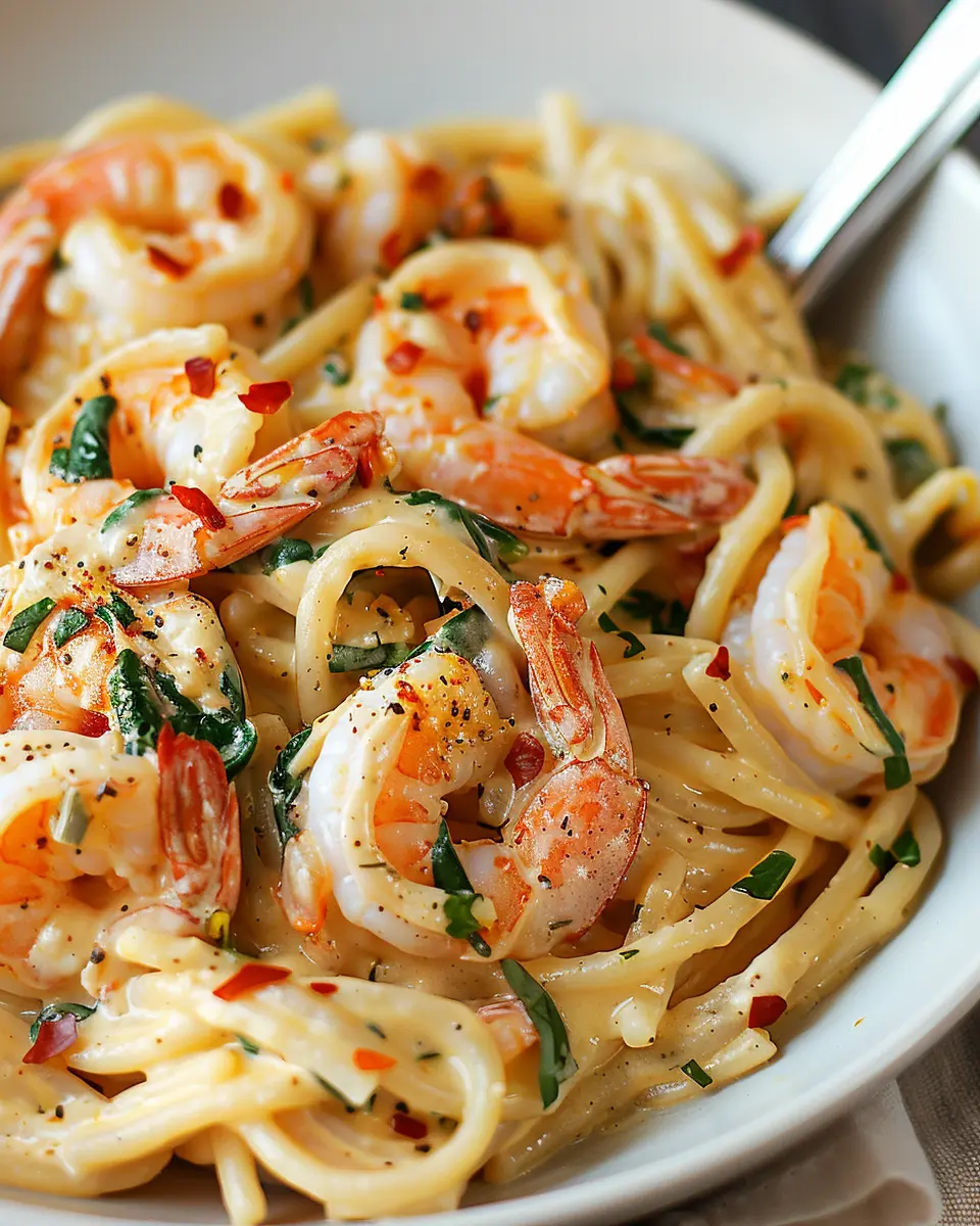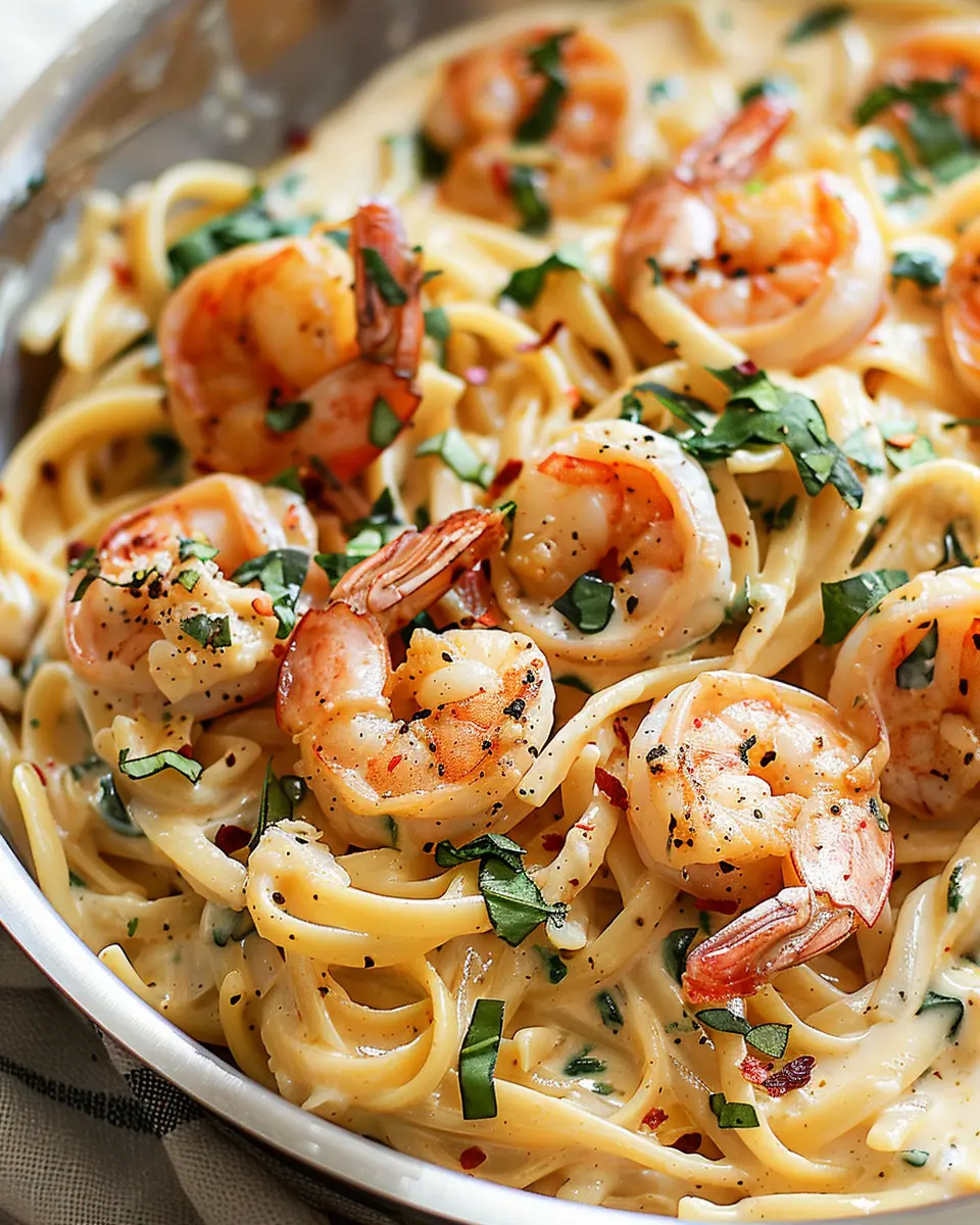 A delightful dish that combines creamy sauces with succulent shrimp and linguine.