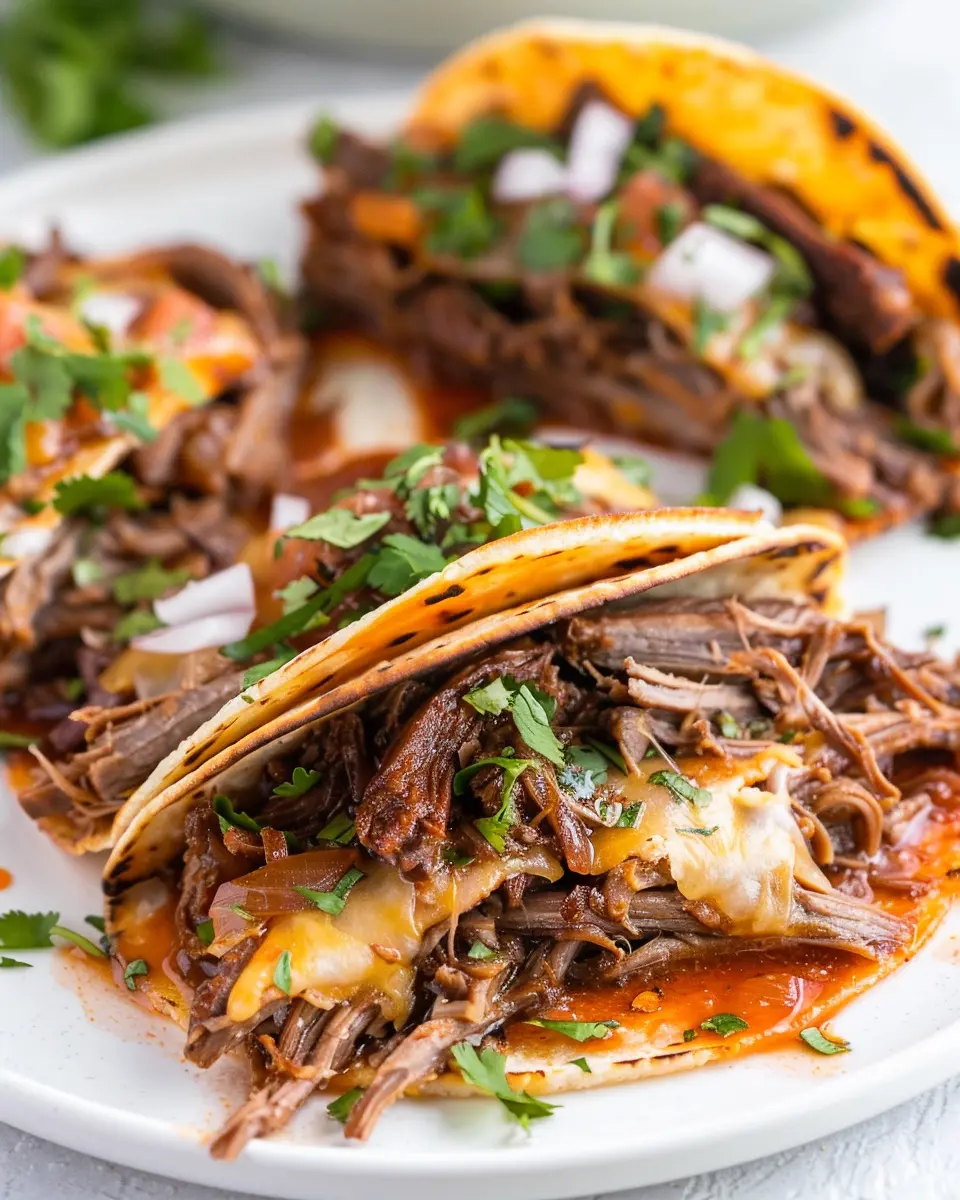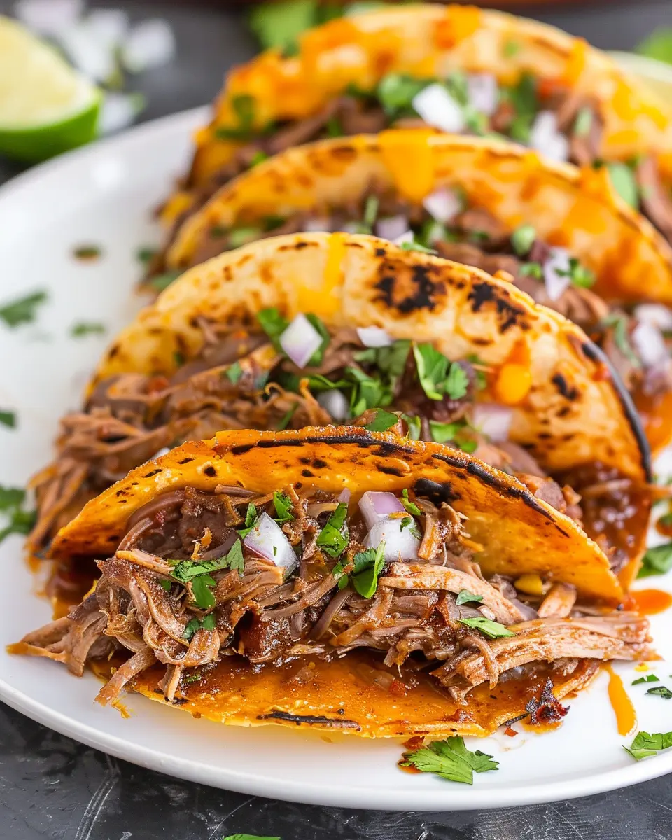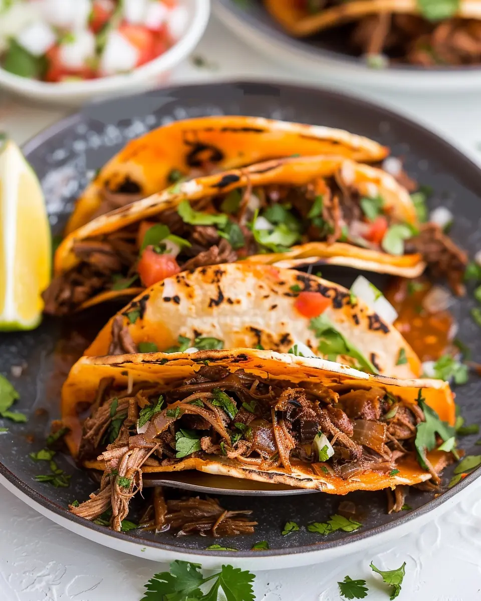 - Assembly: Fill each tortilla with shredded beef and top with diced onions, cilantro, and a squeeze of lime.