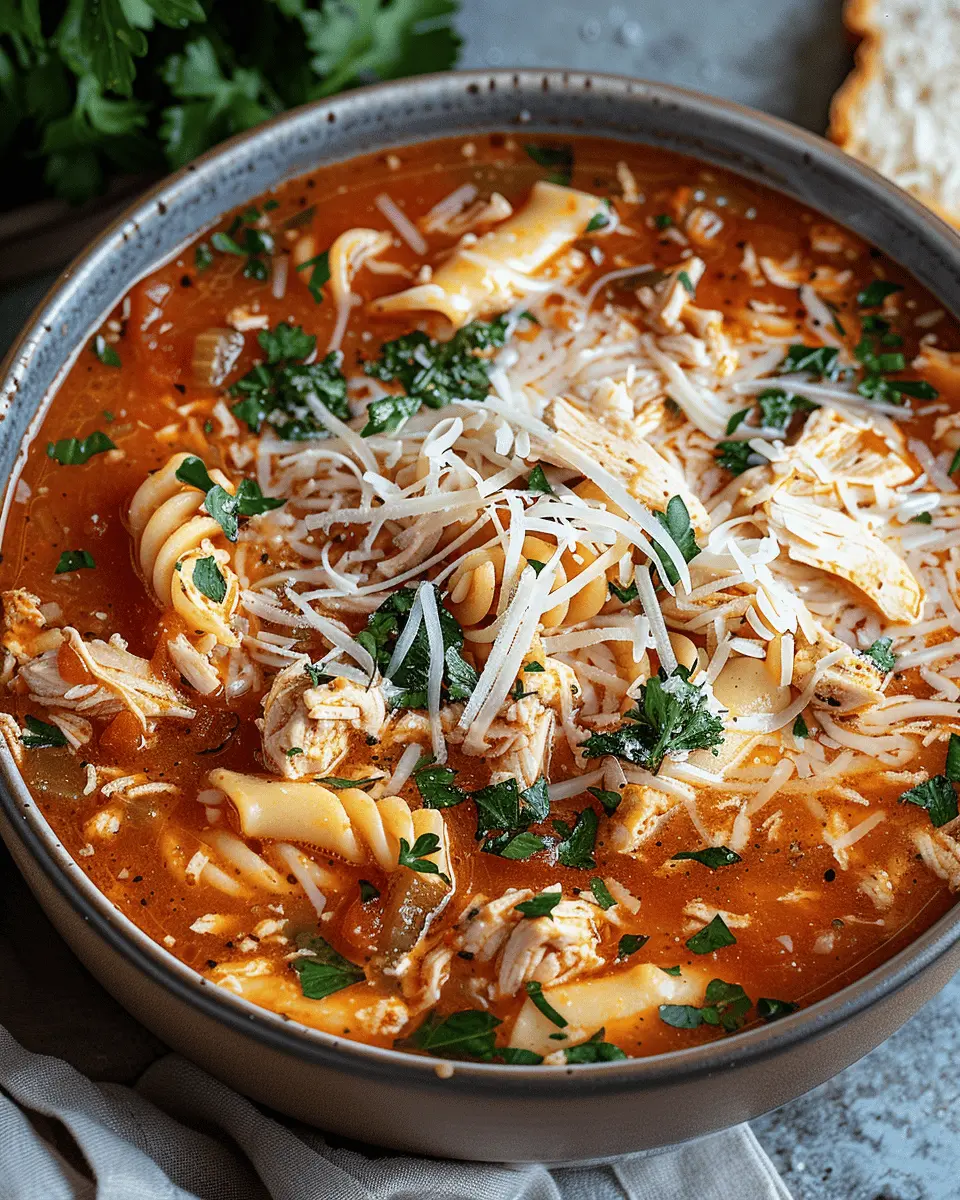 Crockpot Chicken Parmesan Soup is a delicious and easy meal that combines tender chicken, rich tomato flavor, and cheesy goodness.