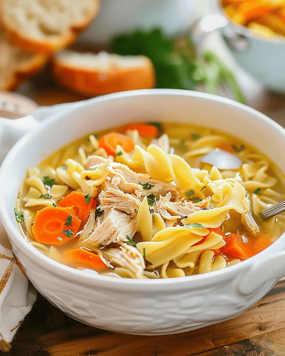 A warm and comforting chicken noodle soup made with egg noodles, perfect for cozy days.