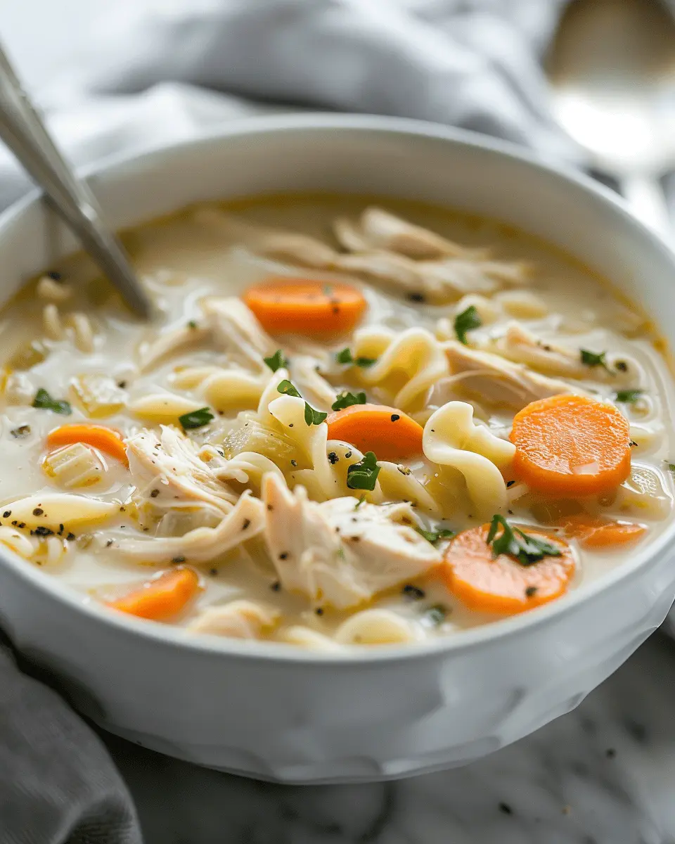 This Easy Creamy Chicken Noodle Soup is a comforting blend of tender chicken, creamy broth, and savory turkey bacon.