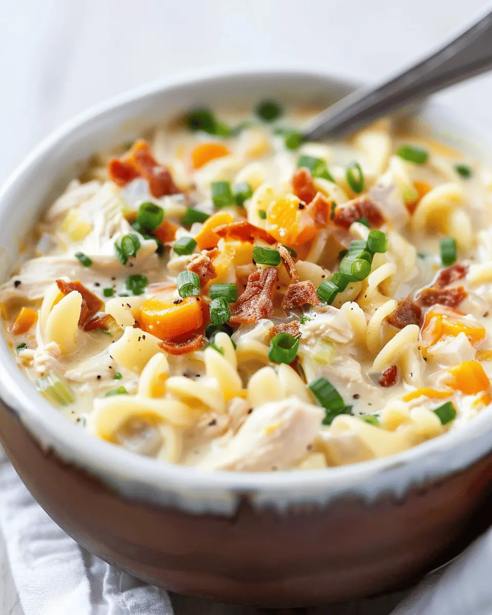 A delicious twist on traditional chicken noodle soup with creamy flavors and turkey bacon.