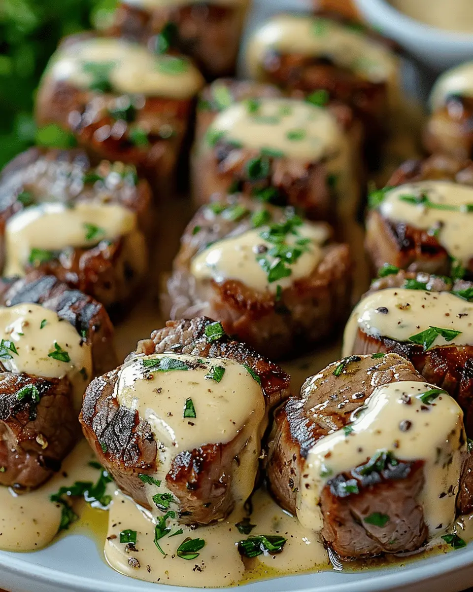 Delight in the rich flavors of garlic butter steak bites paired with a creamy Parmesan sauce, perfect for an indulgent treat.