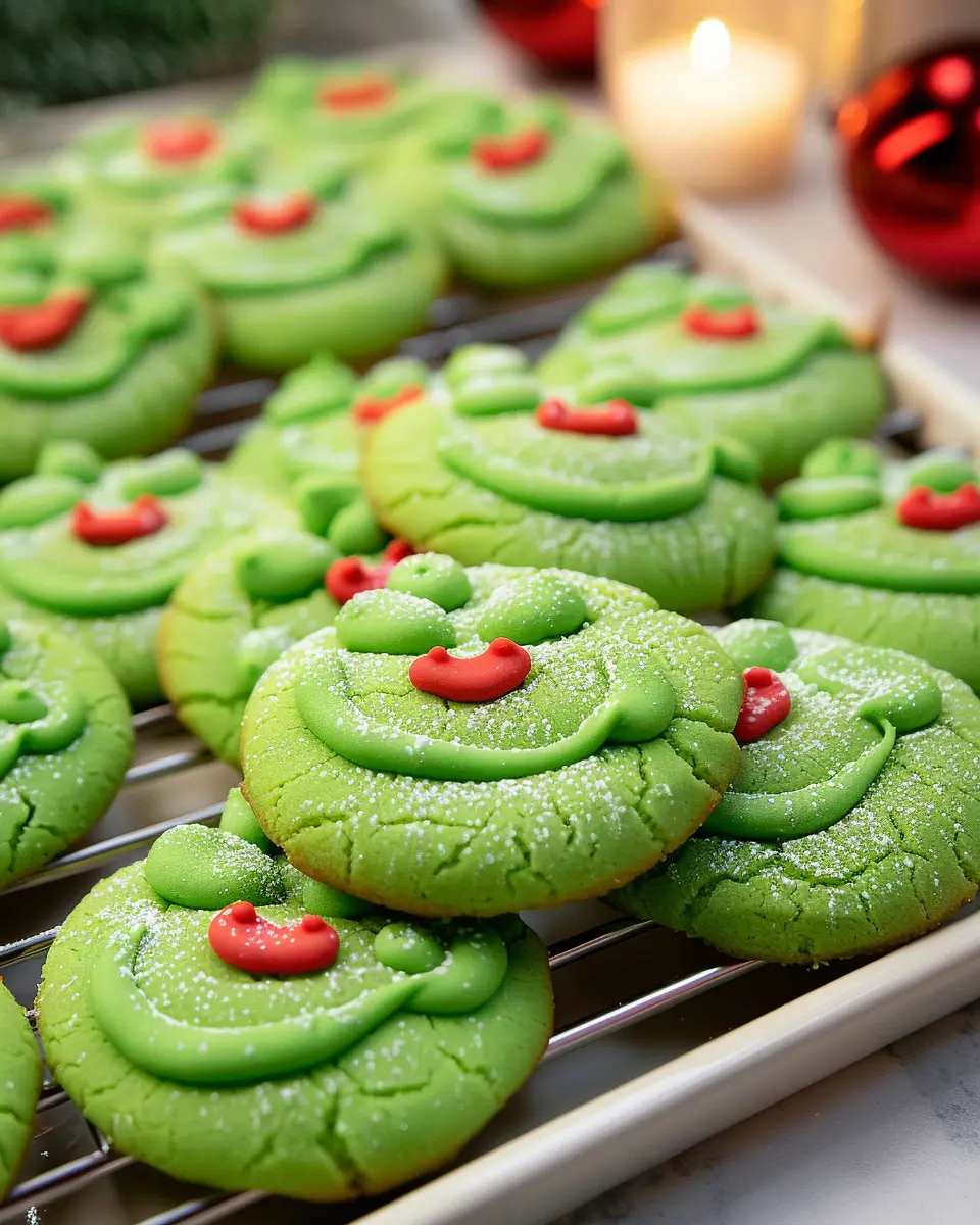 - Let the cookies cool, then decorate with red icing to create Grinch faces.