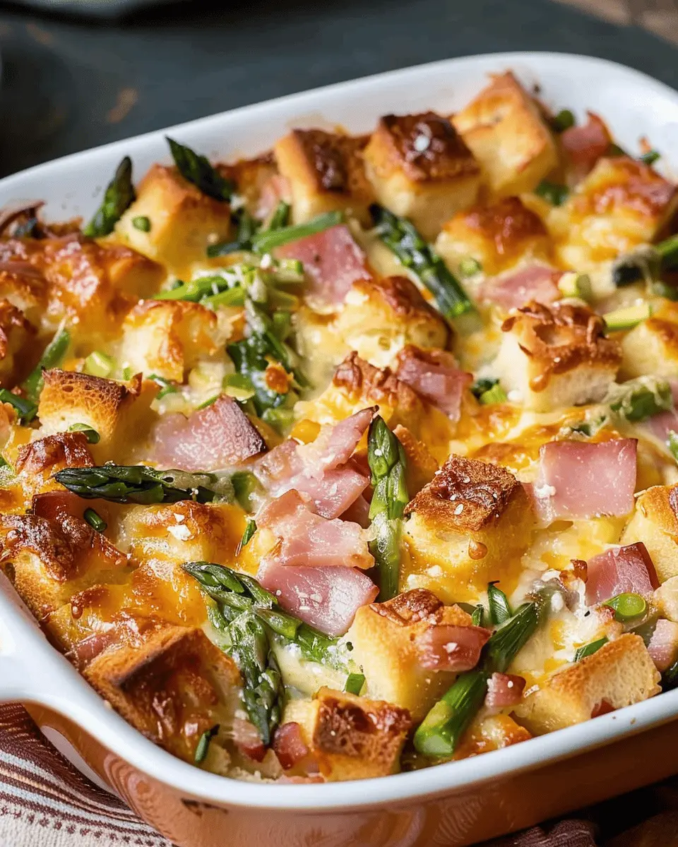 A delicious and hearty dish combining ham, asparagus, and layers of bread for a flavorful strata.