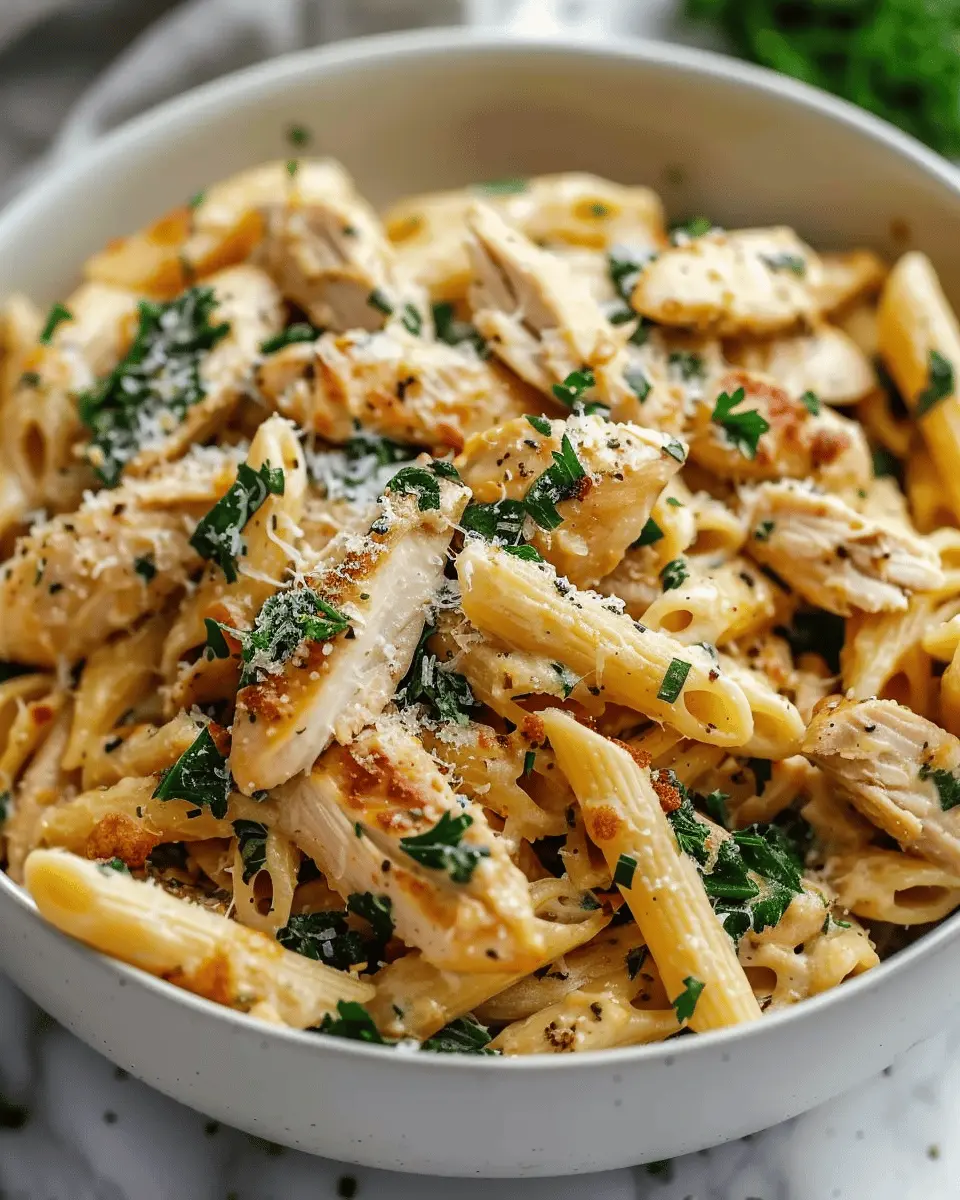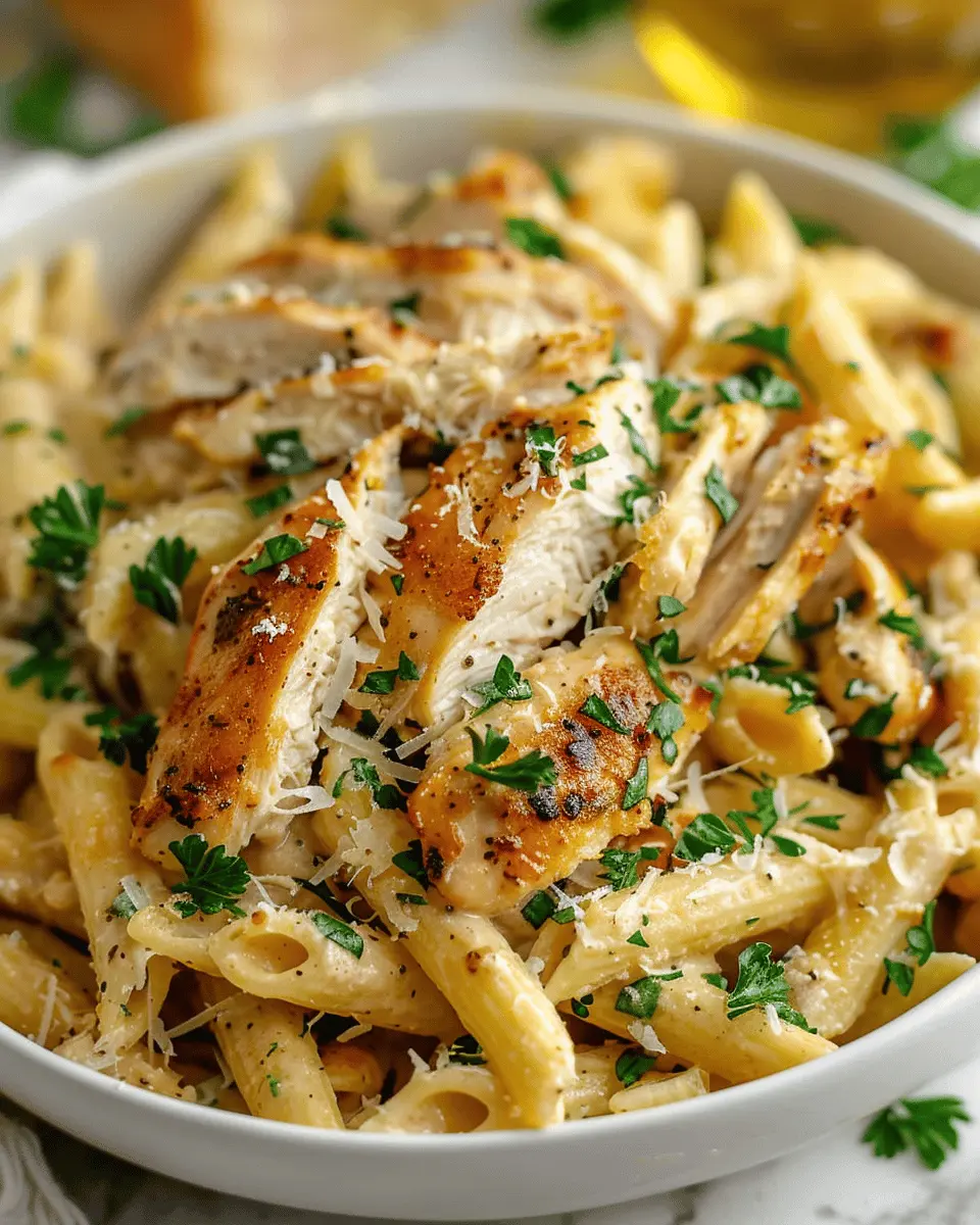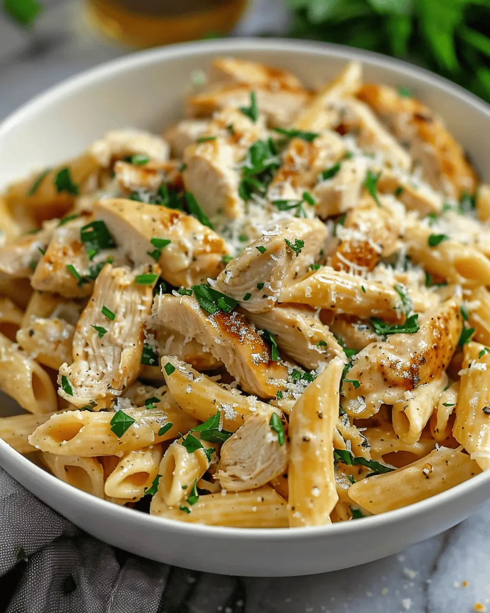 A healthy and tasty pasta dish featuring garlic, Parmesan cheese, and tender chicken, perfect for a weeknight dinner.