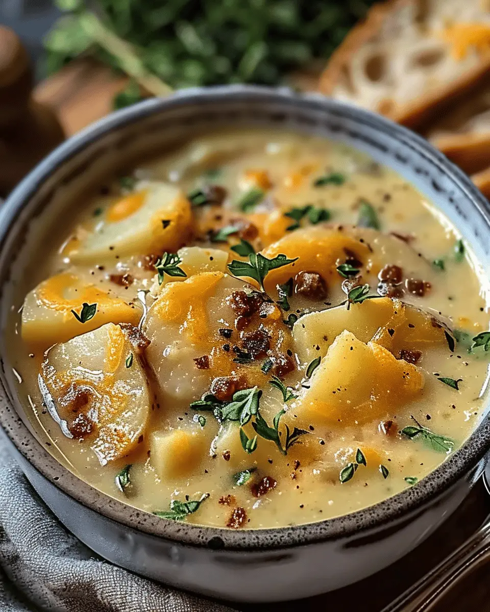 PrintHearty Cheddar Garlic Herb Potato Soup with Turkey Bacon Delight