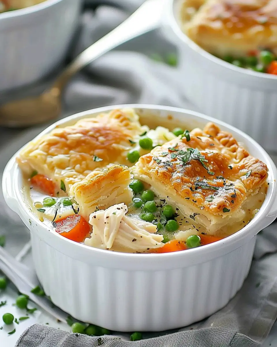 Finally, preheat your oven to 400°F (200°C). Lay your cut puff pastry squares on a baking sheet lined with parchment paper. Bake them for about 15-20 minutes, or until they’re puffed and golden brown. When they’re ready, gently place the puff pastry over each bowl of the piping hot chicken pot pie soup. The result is nothing short of a masterpiece – a sprightly, savory soup finished with a flaky, buttery topping.