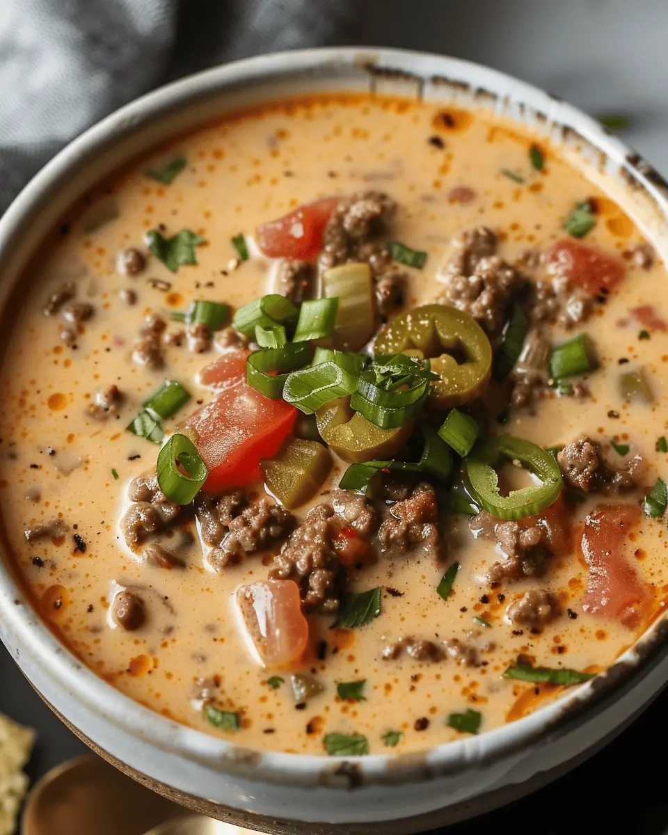 PrintKeto Cheeseburger Soup: Easy, Comforting Taste with Turkey Bacon