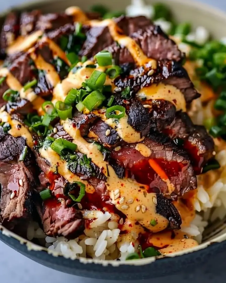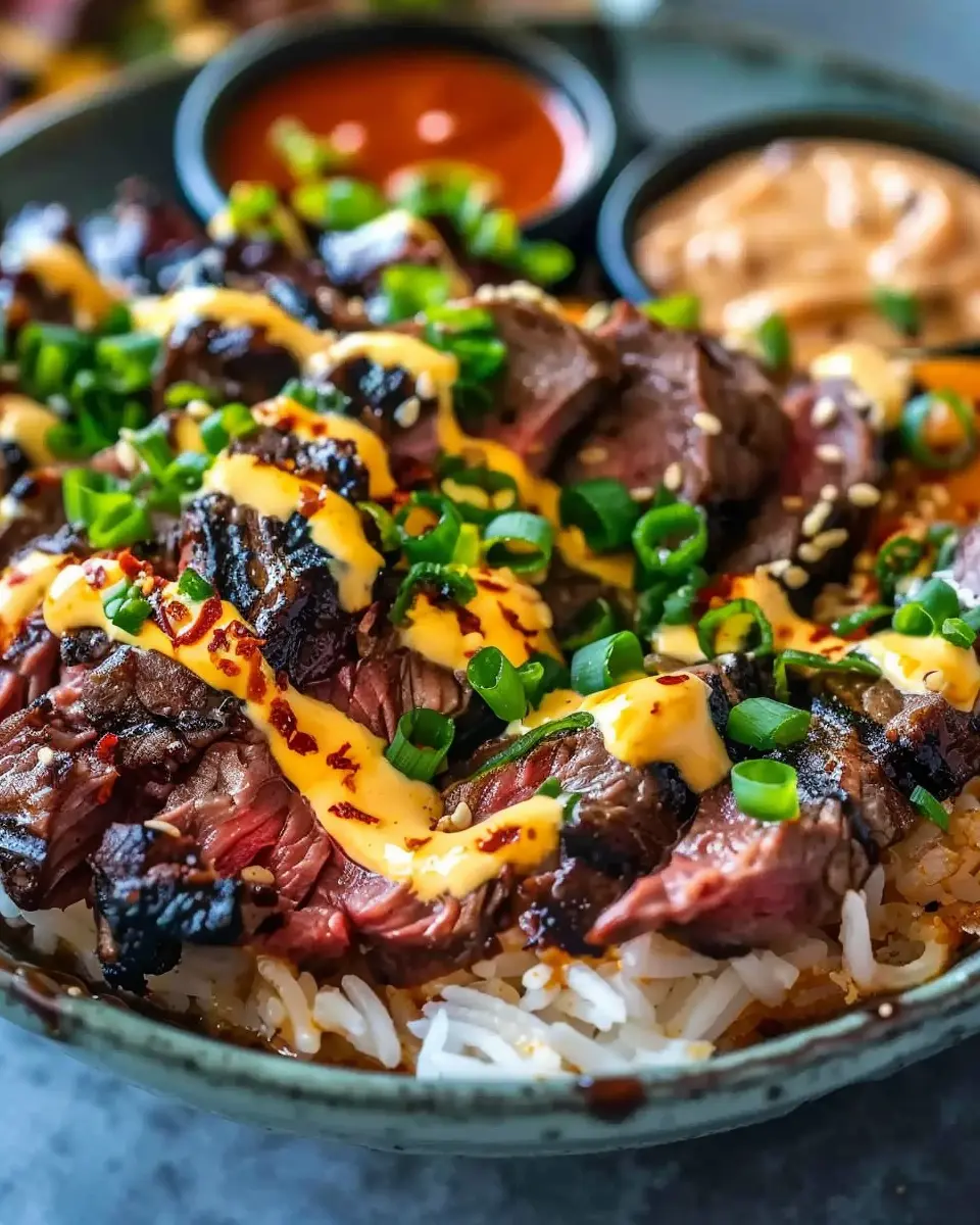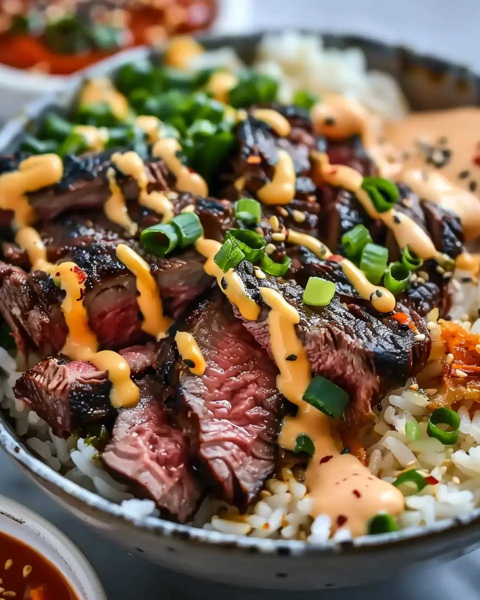 PrintKorean BBQ Steak Rice Bowls with Spicy Cream Sauce Delight