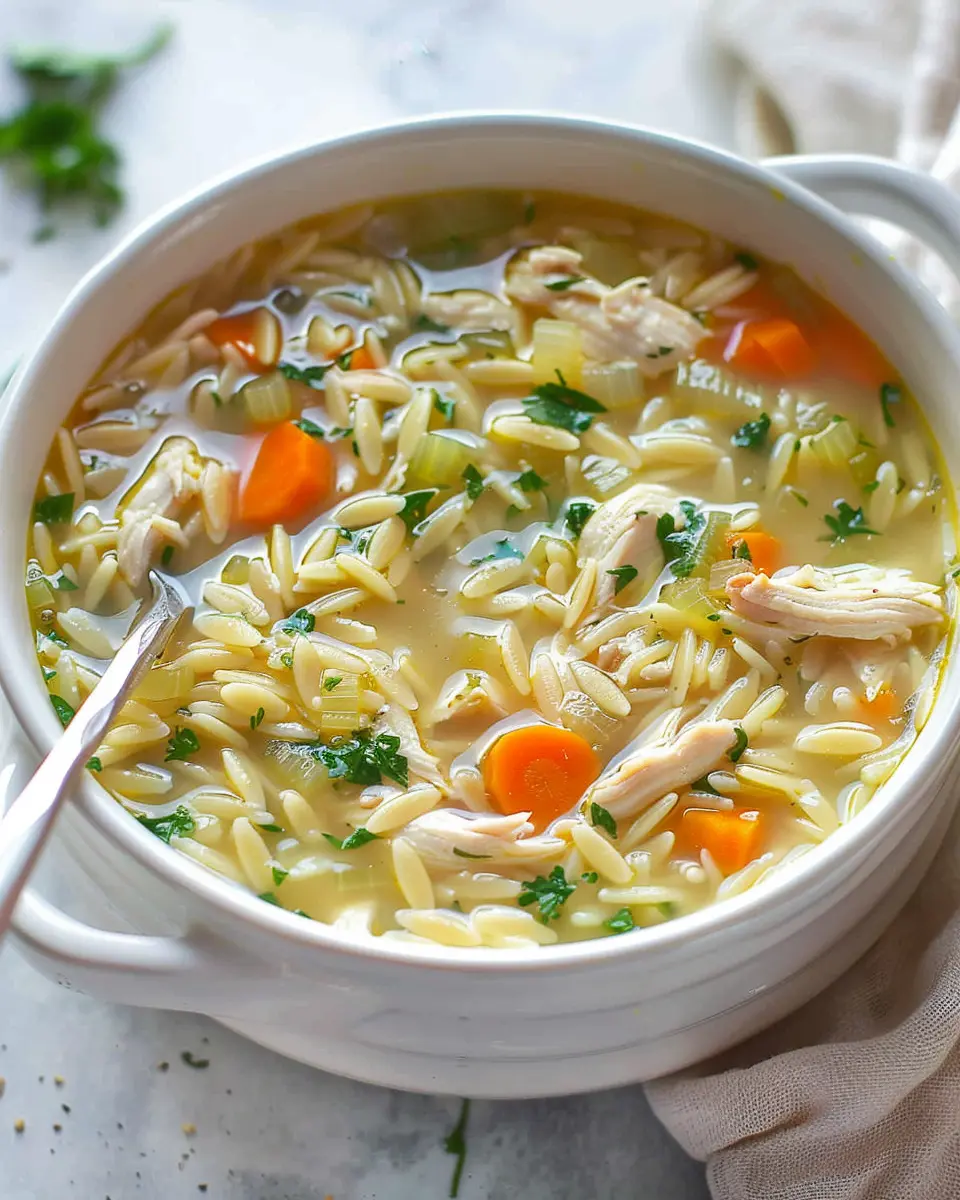 A warm and comforting soup made with tender chicken, orzo pasta, and a zesty lemon flavor. Perfect for any night!