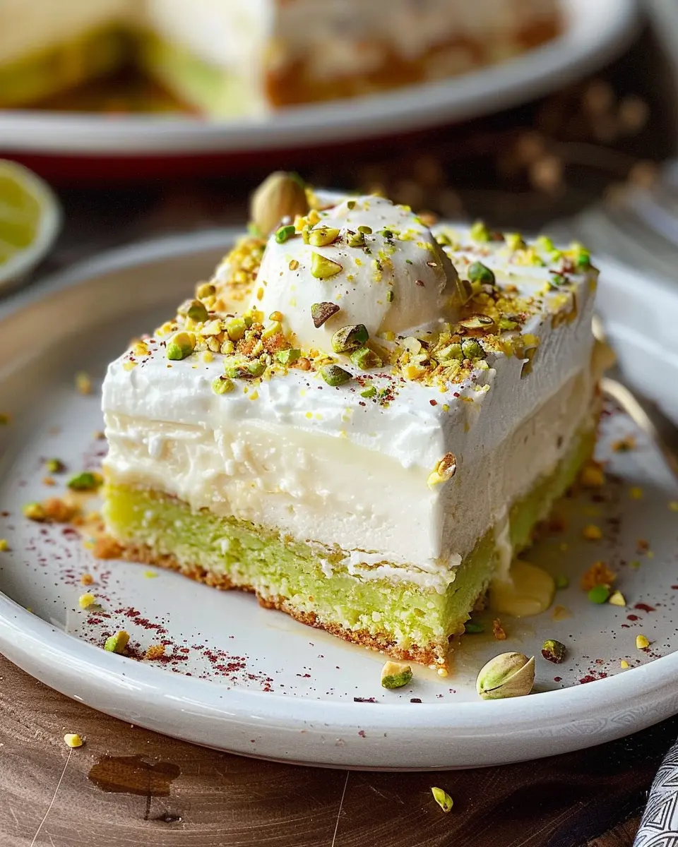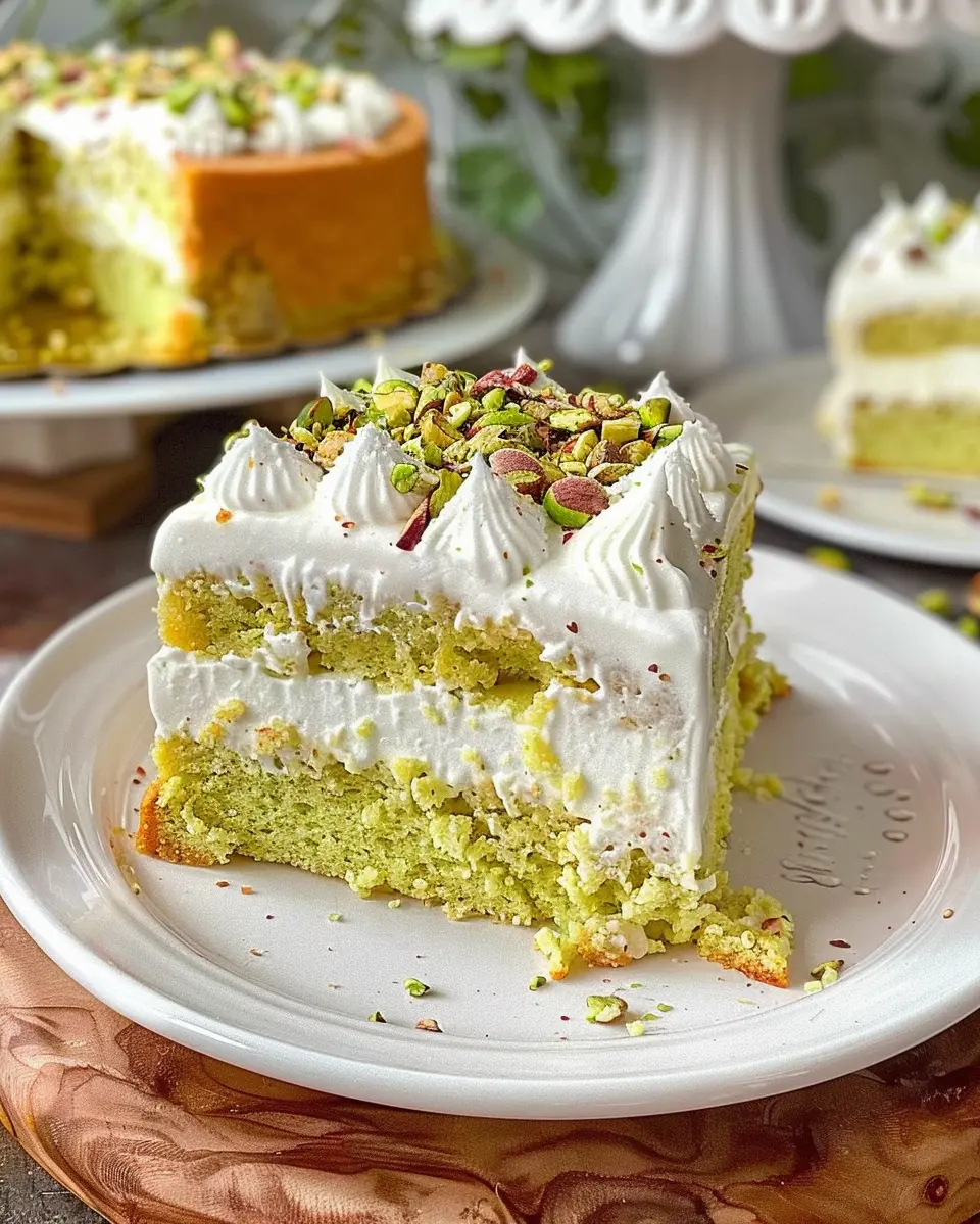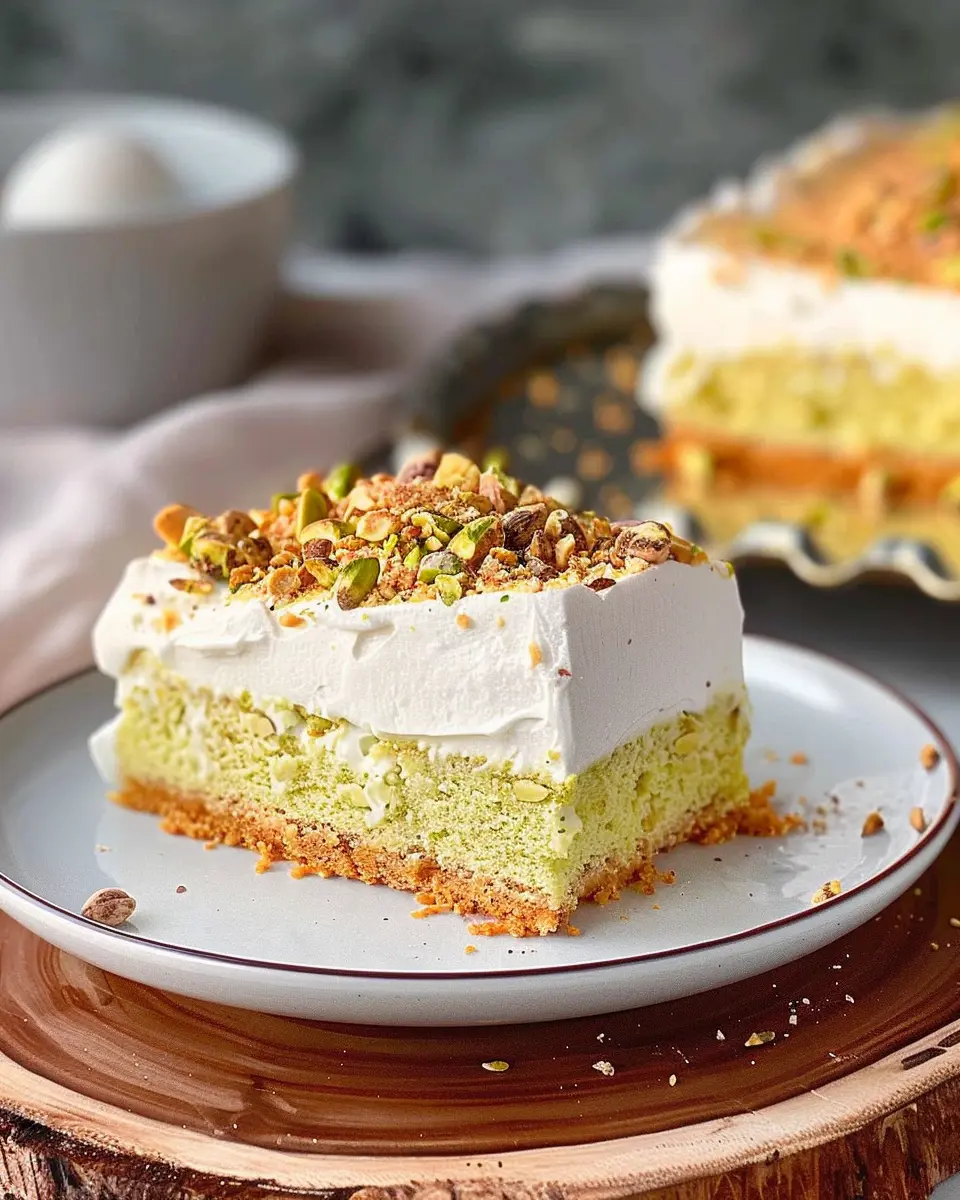 • Frosting: Once the cake has soaked up the milk mixture, spread the whipped cream over the top. You could garnish with extra chopped pistachios or even a sprinkle of crushed graham crackers for a fun twist.