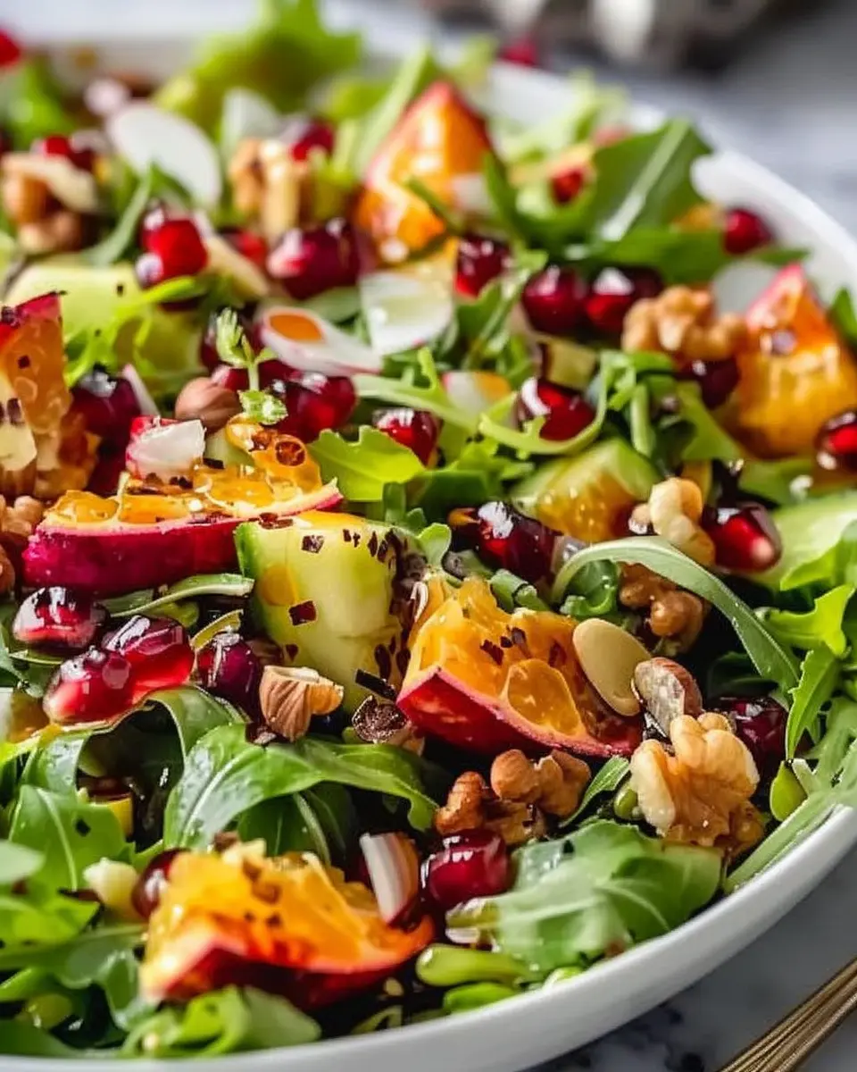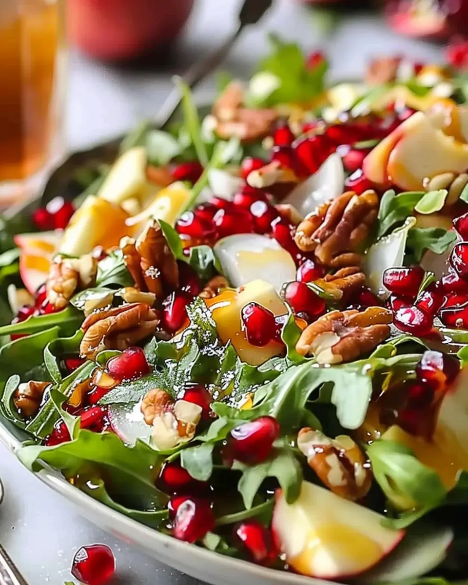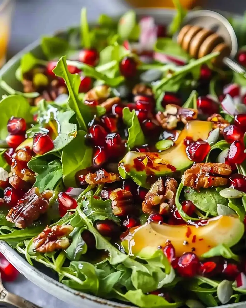 A delightful and festive salad that’s perfect for the holiday season, featuring fresh pomegranate seeds and a tangy honey mustard dressing.