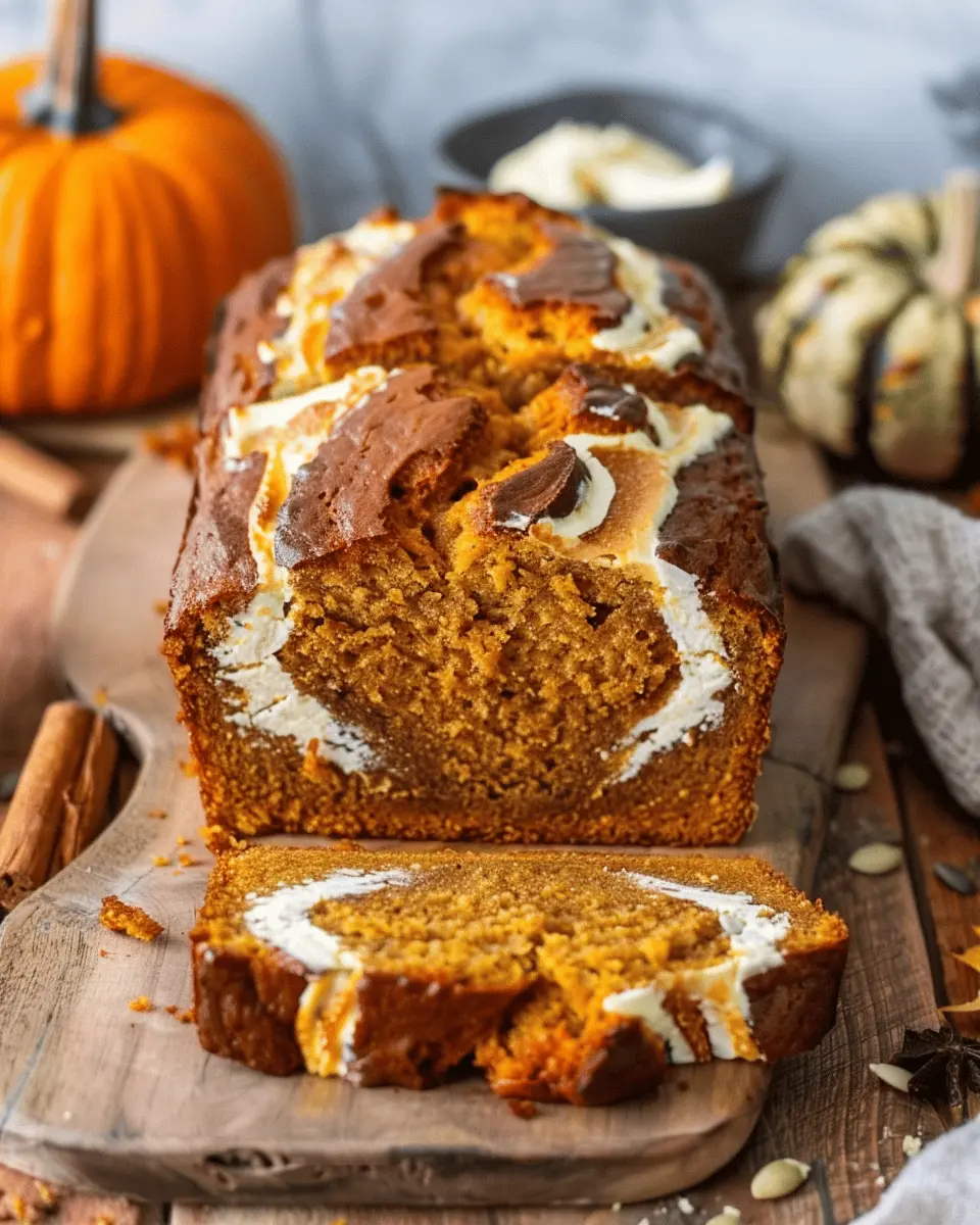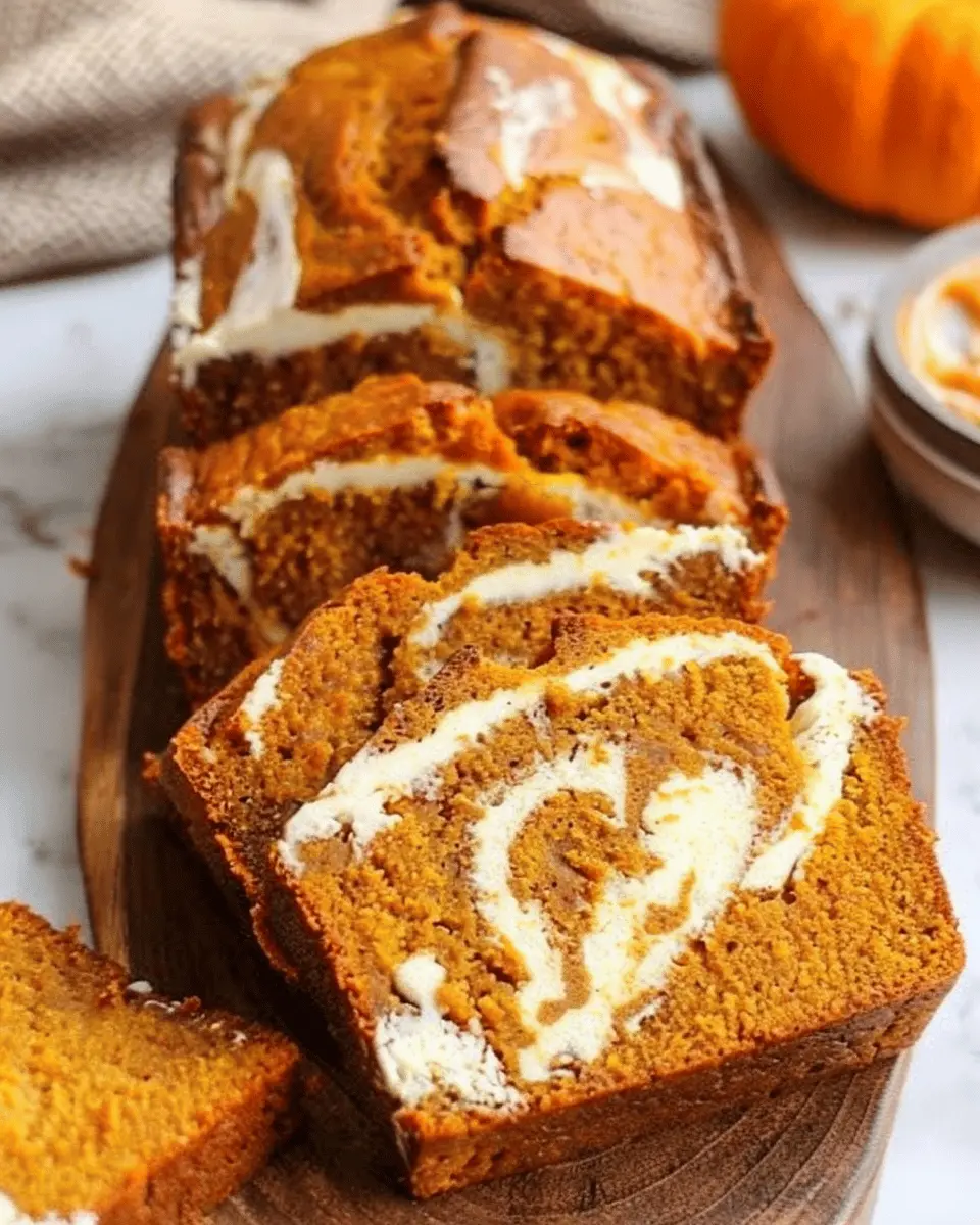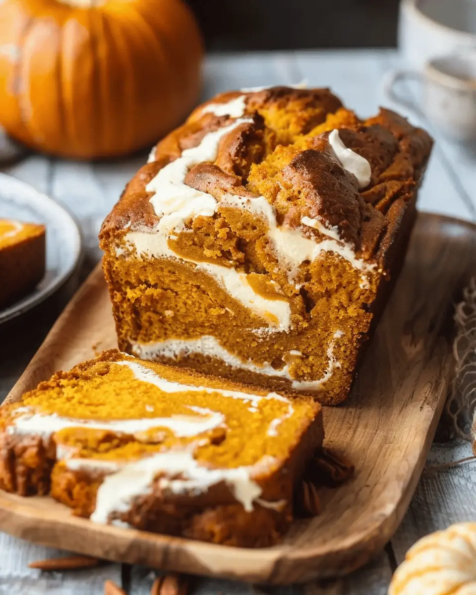 A deliciously moist pumpkin bread with a rich cream cheese swirl, perfect for fall baking.