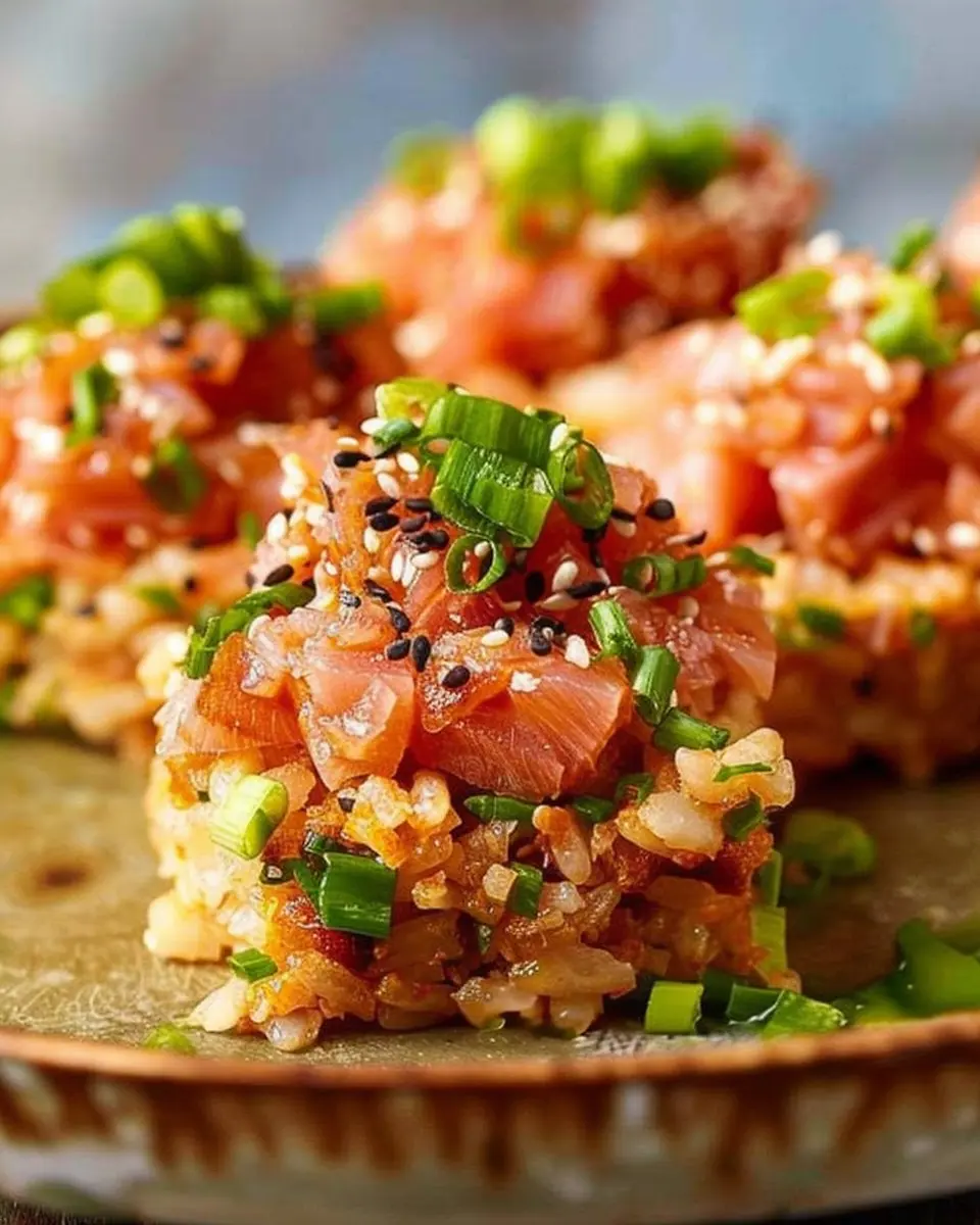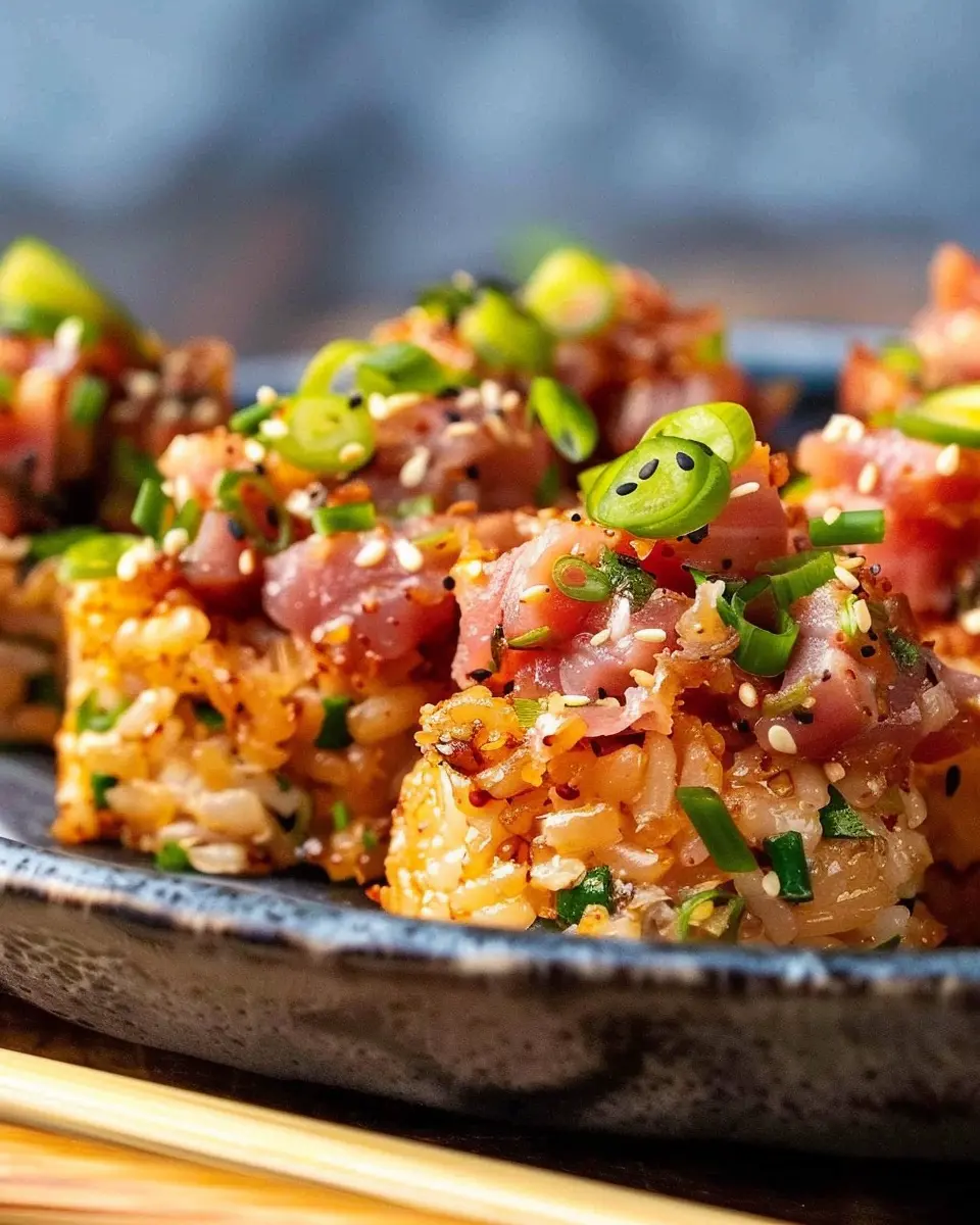 Experience a delicious fusion with these Spicy Tuna Crispy Rice bites that offer a perfect blend of flavor and crunch. Ideal for snacking!