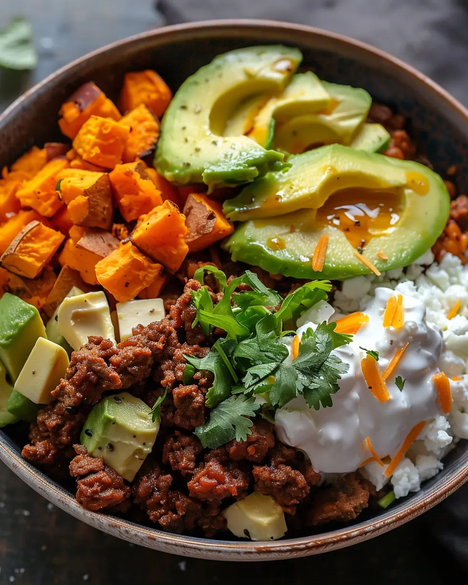 A delicious and easy-to-make Sweet Potato Taco Bowl featuring a twist of turkey bacon.