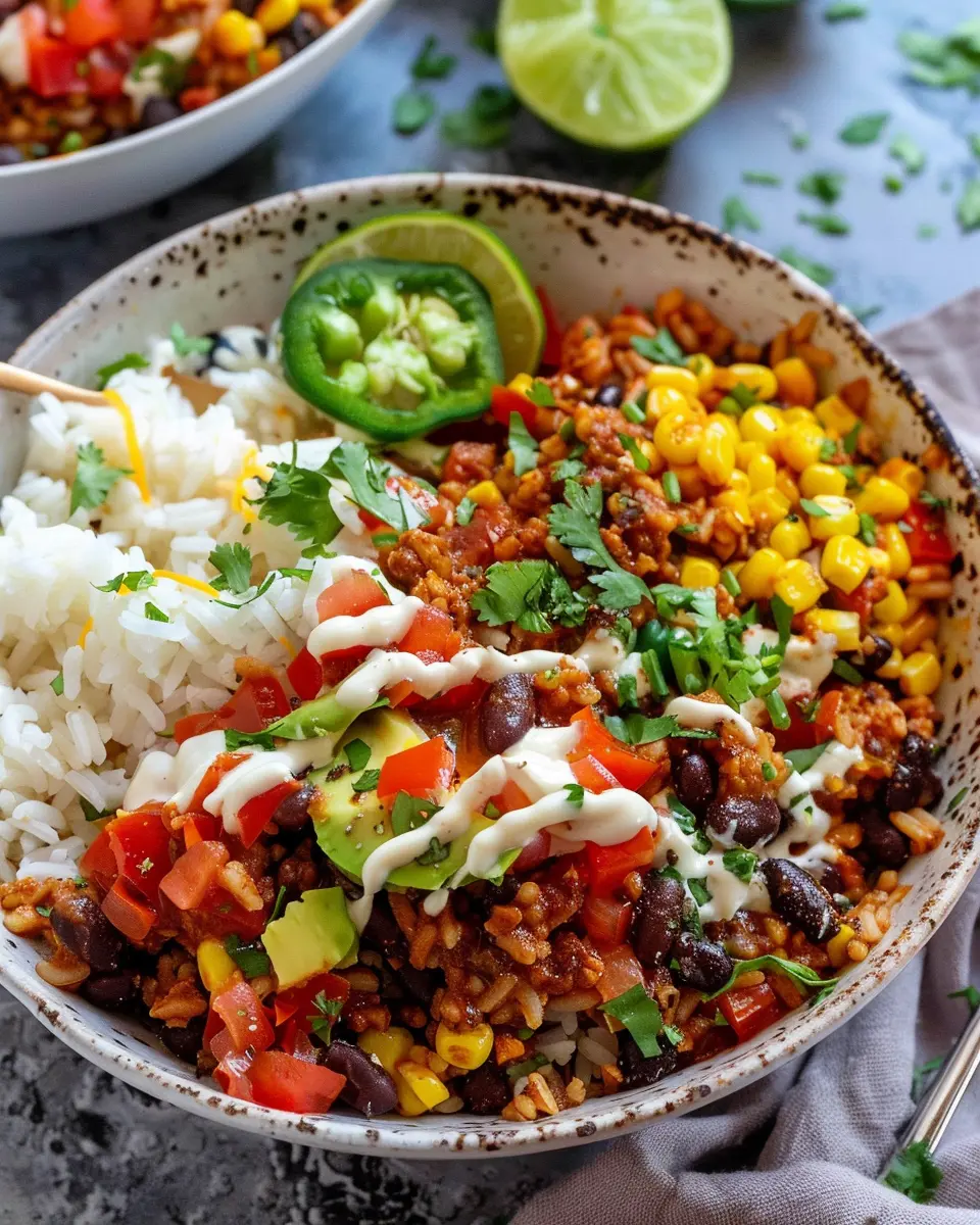 If you’re seeking a delicious and fulfilling twist on the classic Taco Rice Bowl, try the Vegetarian Taco Rice Bowl. It’s a plant-based delight brimming with flavors! Simply replace ground beef with a mix of black beans and corn for protein-rich goodness. Add diced bell peppers and zucchini for texture, and top with avocado and a zesty lime crema made from yogurt and lime juice. This hearty bowl packs a nutritional punch and makes an excellent meatless Monday meal.