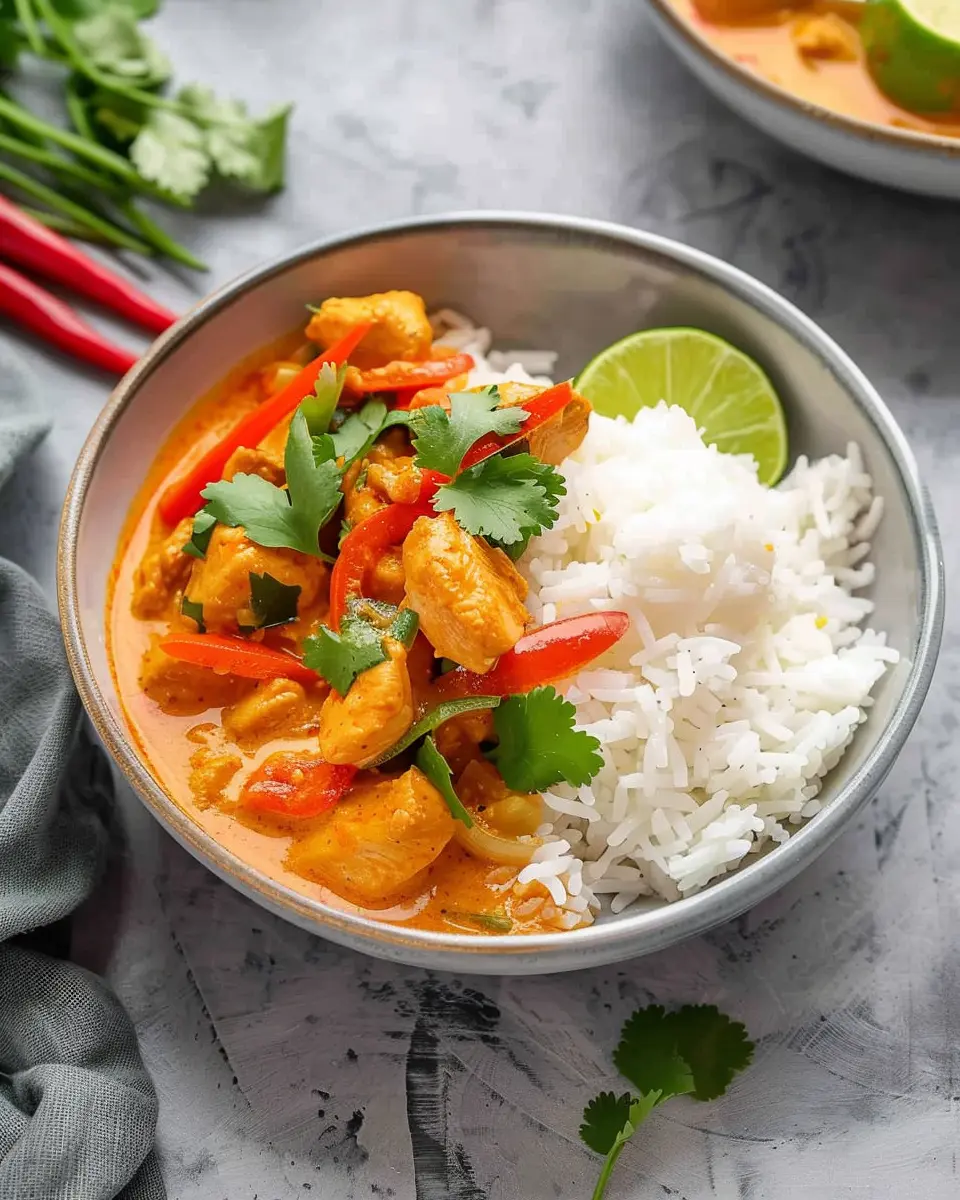 Serving Thai Red Curry Chicken can be an art. Start with a base of rice, gently nestling your vibrant chicken curry in the center. Garnish with fresh basil or cilantro for a pop of green. Use a slice of lime on the side for that zesty finish!